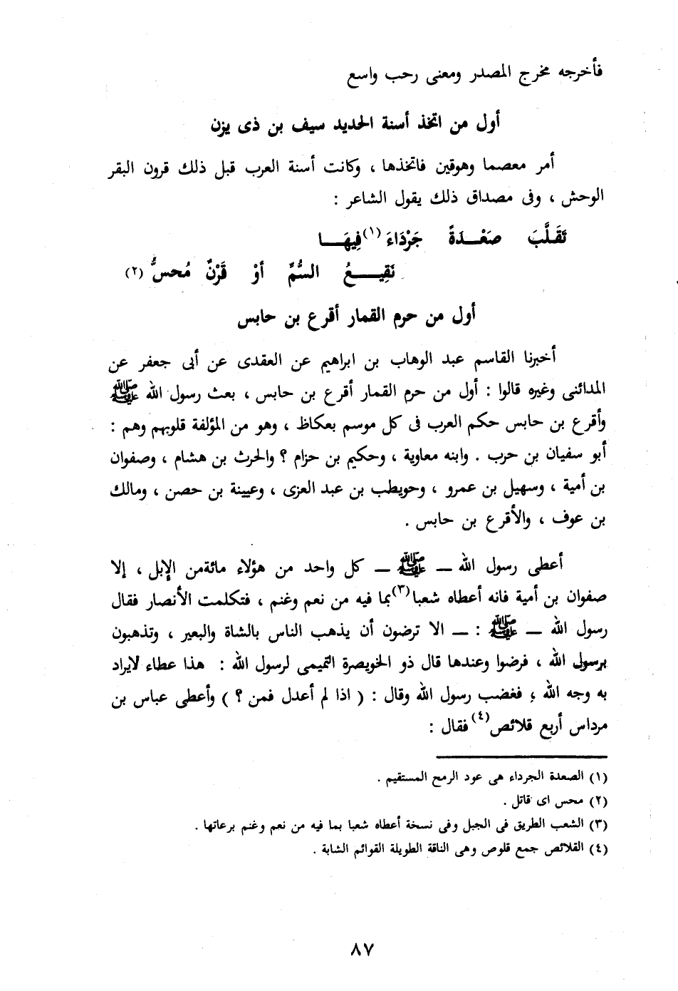 أمر معصما وهوقين فاتخذها، وكانت أسنة العرب قبل ذلك قرون البقر الوحش، وفى مصداق ذلك يقول الشاعر: