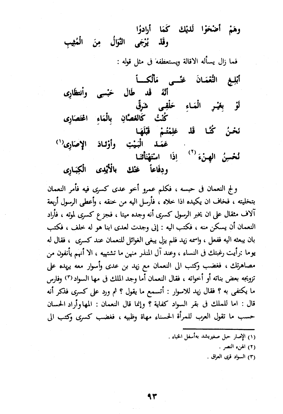 ولج النعمان فى حبسه، فكلم عمرو أخو عدى كسرى فيه فأمر النعمان بتخليته، فخاف ان يكيده اذا خلاه، فأرسل اليه من خنقه، وأعطى الرسول أربعة آلاف مثقال على ان يخبر الرسول كسرى أنه وجده ميتا، فجزع كسرى لموته، فأراد النعمان أن يسكن منه، فكتب اليه: إنى وجدت لعدى ابنا هو له خلف، فكتب بان يبعثه اليه ففعل، واسمه زيد فلم يزل يبغى الغوائل للنعمان عند كسرى، فقال له يوما: رأيت رغبتك فى النساء، وعند آل المنذر منهن ما تشتهيه، الا أنهم يأنفون من مصاهرتك، فغضب وكتب الى النعمان مع زيد بن عدى وأسوار معه يريده على تزويجه بعض بناته أو أخواته، فقال النعمان أما وجد الملك فى مها السواد «3» وفارس ما يكتفى به؟ فقال زيد للاسوار: أتسمع ما يقول؟ ثم ورد على كسرى فذكر أنه قال: اما للملك فى بقر السواد كفاية؟ وإنما قال النعمان: المها وأراد الحسان حسب ما تقول العرب للمرأة الحسناء مهاة وظبيه، فغضب كسرى وكتب الى
