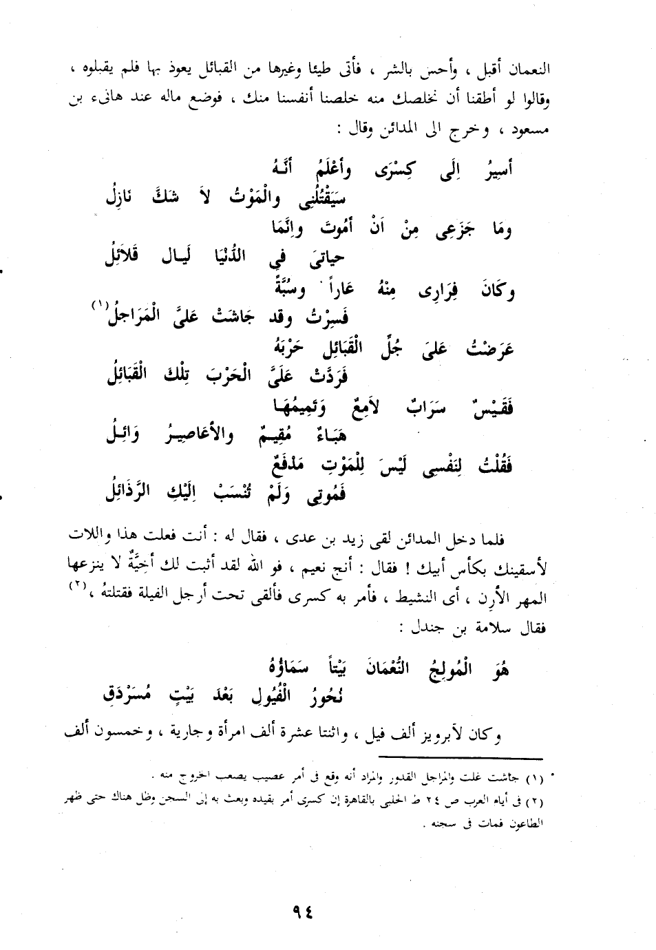 فلما دخل المدائن لقى زيد بن عدى، فقال له: أنت فعلت هذا واللات لأسقينك بكأس أبيك! فقال: أنج نعيم، فو الله لقد أثبت لك أخيّة لا ينزعها المهر الأرن، أى النشيط، فأمر به كسرى فألقى تحت أرجل الفيلة فقتلته، «2» فقال سلامة بن جندل: