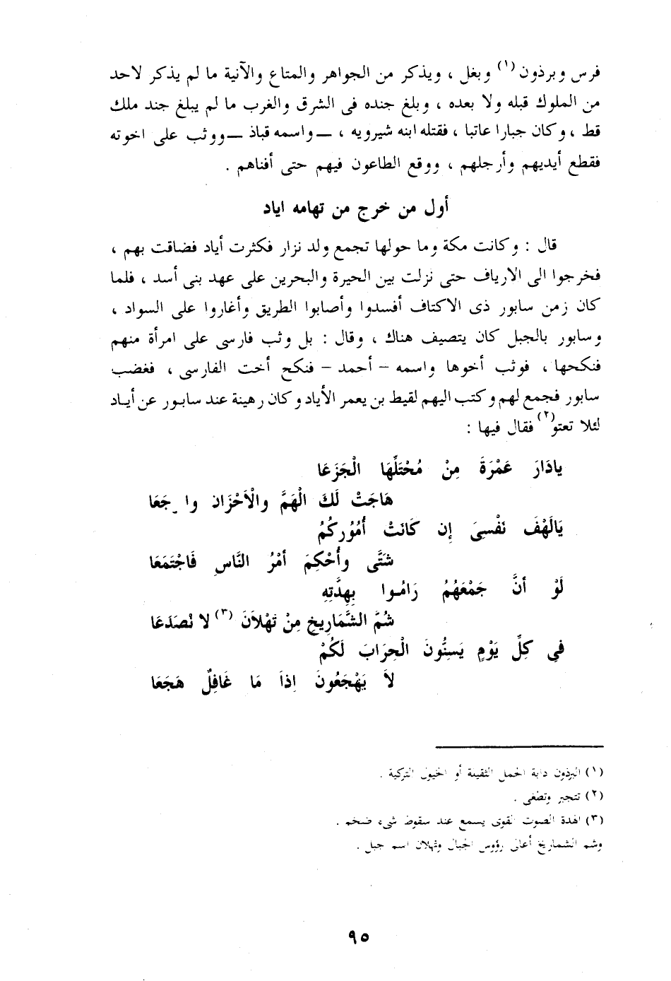 قال: وكانت مكة وما حولها تجمع ولد نزار فكثرت أياد فضاقت بهم، فخرجوا الى الارياف حتى نزلت بين الحيرة والبحرين على عهد بنى أسد، فلما كان زمن سابور ذى الاكتاف أفسدوا وأصابوا الطريق وأغاروا على السواد، وسابور بالجبل كان يتصيف هناك، وقال: بل وثب فارسى على امرأة منهم فنكحها، فوثب أخوها واسمه- أحمد- فنكح أخت الفارسى، فغضب سابور فجمع لهم وكتب اليهم لقيط بن يعمر الأياد وكان رهينة عند سابور عن أياد لئلا تعتو «2» فقال فيها: