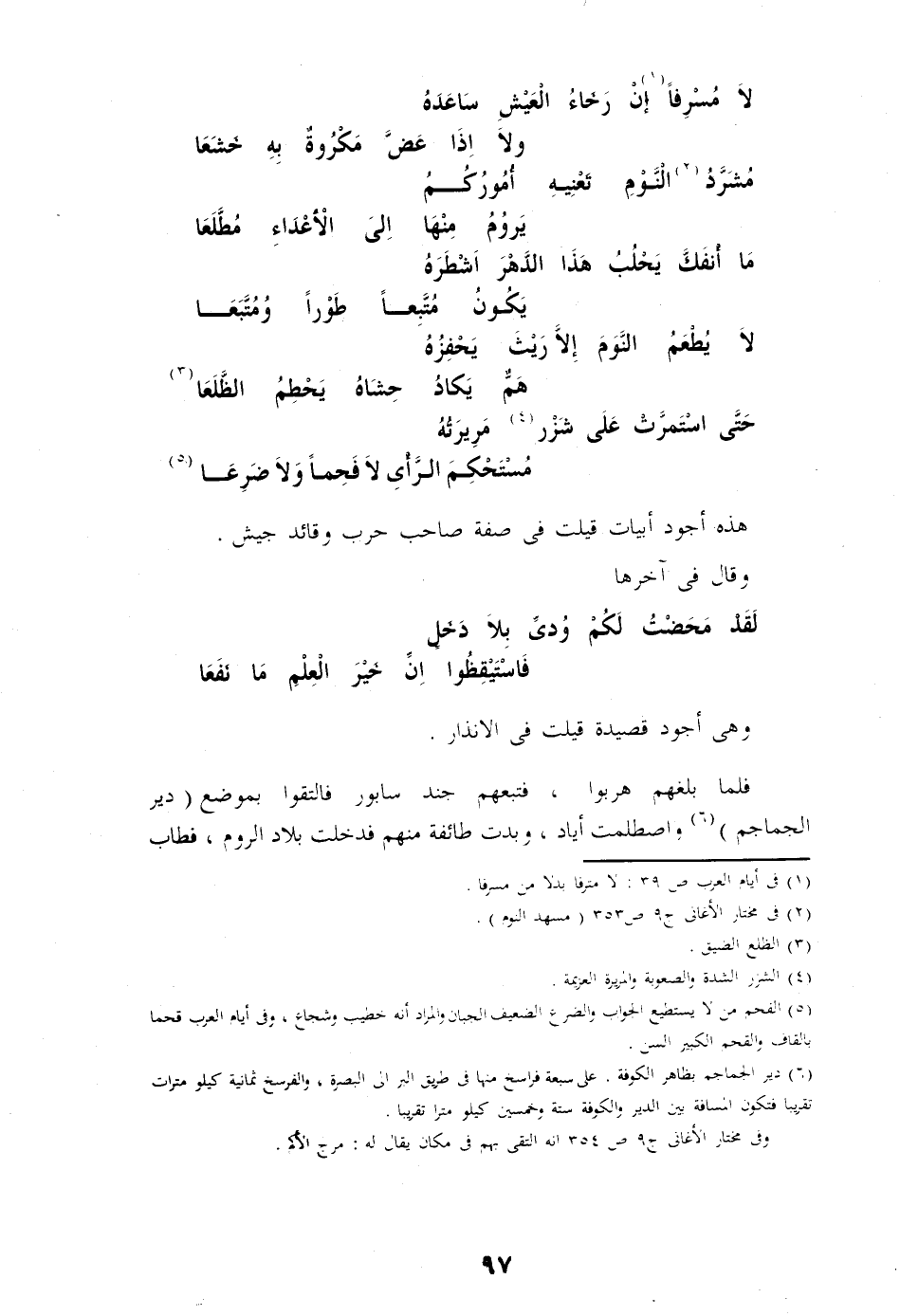 فلما بلغهم هربوا، فتبعهم جند سابور فالتقوا بموضع (دير الجماجم) «6» واصطلمت أياد، وبدت طائفة منهم فدخلت بلاد الروم، فطاب