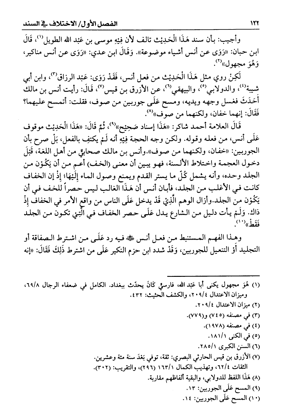 قَالَ العلامة أحمد شاكر: ((هَذَا إسناد صَحِيْح)) (¬9)، ثُمَّ قَالَ: ((هَذَا الْحَدِيْث موقوف عَلَى أنس، من فعله وقوله. ولكن وجه الحجة فِيْهِ أنه لَمْ يكتفِ بالفعل، بَلْ صرح بأن الجوربين: ((خفان، ولكنهما من صوف)).وأنس بن مالك صحابيٌّ من أهل اللغة، قَبْلَ دخول العجمة واختلاط الألسنة، فهو يبين أن معنى (الخف) أعم من أن يَكُوْن من الجلد وحده، وأنه يشمل كُلّ ما يستر القدم ويمنع وصول الماء إِلَيْهَا؛ إِذْ إن الخفاف كانت في الأغلب من الجلد، فأبان أنس أن هَذَا الغالب ليس حصراً للخف في أن يَكُوْن من الجلد. وأزال الوهم الَّذِيْ قَدْ يدخل عَلَى الناس من واقع الأمر في الخفاف إِذْ ذاك. وَلَمْ يأت دليل من الشارع يدل عَلَى حصر الخفاف في الَّتِيْ تكون من الجلد فَقَطْ)) (¬10).