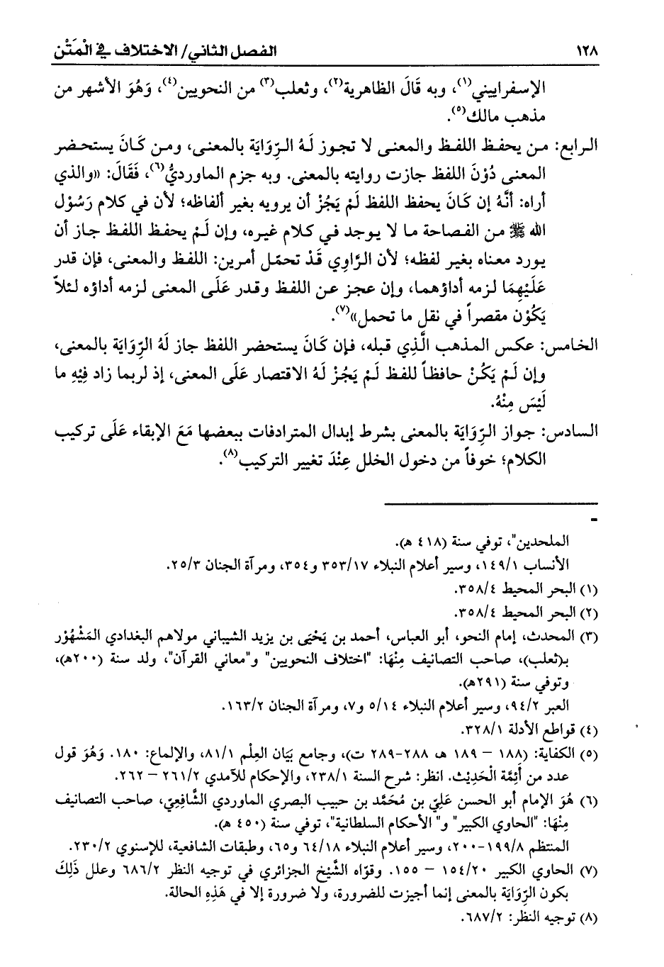 (¬7) الحاوي الكبير 20/ 154 - 155. وقّواه الشَّيْخ الجزائري في توجيه النظر 2/ 686 وعلل ذَلِكَ بكون الرِّوَايَة بالمعنى إنما أجيزت للضرورة، ولا ضرورة إلا في هَذِهِ الحالة.