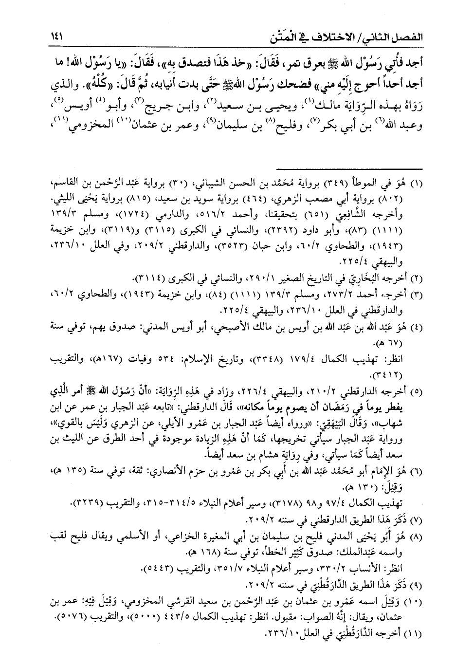 (¬1) هُوَ في الموطأ (349) برواية مُحَمَّد بن الحسن الشيباني، (30) برواية عَبْد الرَّحْمَان بن القاسم، (802) برواية أبي مصعب الزهري، (464) برواية سويد بن سعيد، (815) برواية يَحْيَى الليثي. وأخرجه الشَّافِعِيّ (651) بتحقيقنا، وأحمد 2/ 516، والدارمي (1724)، ومسلم 3/ 139 (1111) (83)، وأبو داود (2392)، والنسائي في الكبرى (3115) و (3119)، وابن خزيمة (1943)، والطحاوي 2/ 60، وابن حبان (3523)، والدارقطني 2/ 209، وفي العلل 10/ 236، والبيهقي 4/ 225.