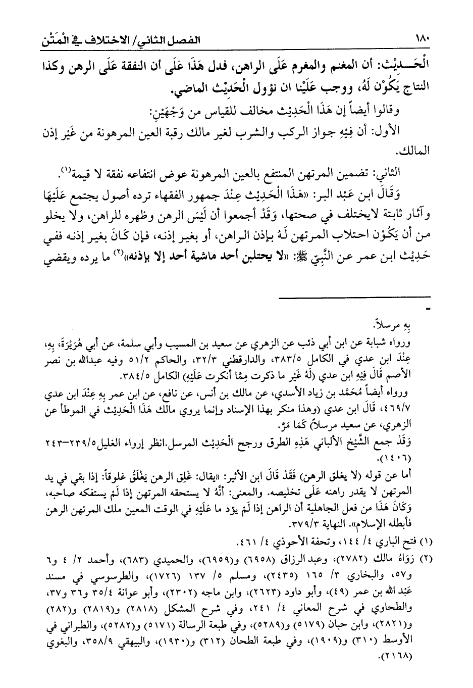 وَقَالَ ابن عَبْد البر: ((هَذَا الْحَدِيْث عِنْدَ جمهور الفقهاء ترده أصول يجتمع عَلَيْهَا وآثار ثابتة لايختلف في صحتها، وَقَدْ أجمعوا أن لَيْسَ الرهن وظهره للراهن، ولا يخلو من أن يَكُوْن احتلاب المرتهن لَهُ بإذن الراهن، أو بغير إذنه، فإن كَانَ بغير إذنه ففي حَدِيْث ابن عمر عن النَّبِيّ - صلى الله عليه وسلم -: ((لا يحتلبن أحد ماشية أحد إلا بإذنه)) (¬2) ما يرده ويقضي