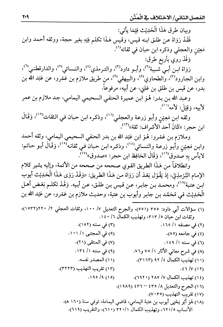 وانطلاقاً من هَذَا الطريق القوي صححه من صححه من الأئمة، وإليه يشير كلام الإمام التِّرْمِذِيّ، إذ يَقُوْل بَعْدَ أن رَوَاهُ من هَذَا الطريق: ((وَقَدْ رَوَى هَذَا الْحَدِيْث أيوب ابن عتبة (¬18)، ومحمد بن جابر، عن قيس بن طلق، عن أبيه. وَقَدْ تكلم بَعْض أهل الْحَدِيْث في مُحَمَّد بن جابر وأيوب بن عتبة، وحديث ملازم بن عَمْرو، عن عَبْد الله بن