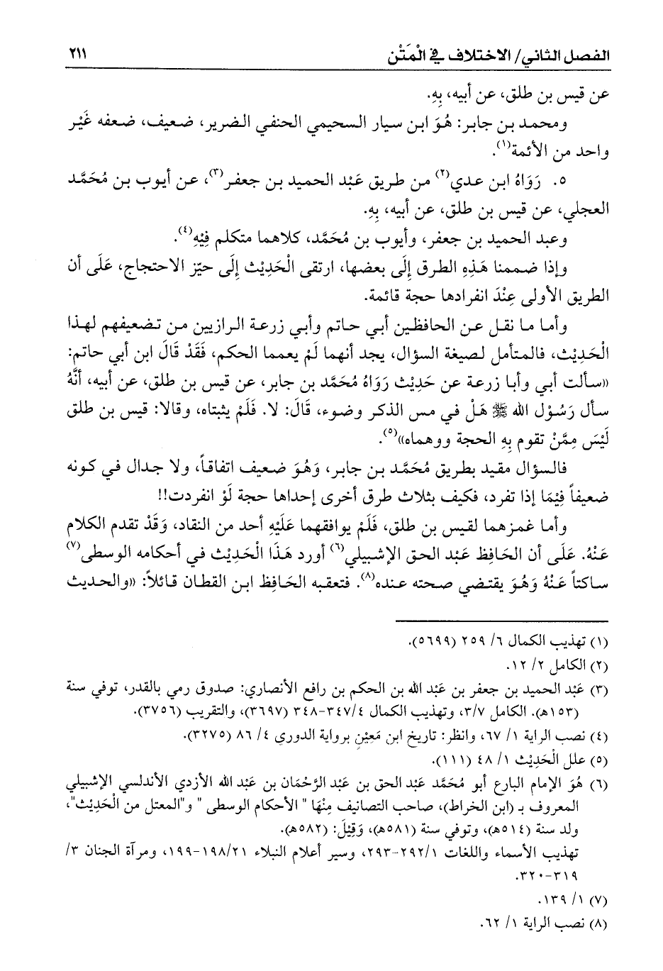 وأما ما نقل عن الحافظين أبي حاتم وأبي زرعة الرازيين من تضعيفهم لهذا الْحَدِيْث، فالمتأمل لصيغة السؤال، يجد أنهما لَمْ يعمما الحكم، فَقَدْ قَالَ ابن أبي حاتم: ((سألت أبي وأبا زرعة عن حَدِيْث رَوَاهُ مُحَمَّد بن جابر، عن قيس بن طلق، عن أبيه، أنَّهُ سأل رَسُوْل الله - صلى الله عليه وسلم - هَلْ في مس الذكر وضوء، قَالَ: لا. فَلَمْ يثبتاه، وقالا: قيس بن طلق لَيْسَ مِمَّنْ تقوم بِهِ الحجة ووهماه)) (¬5).