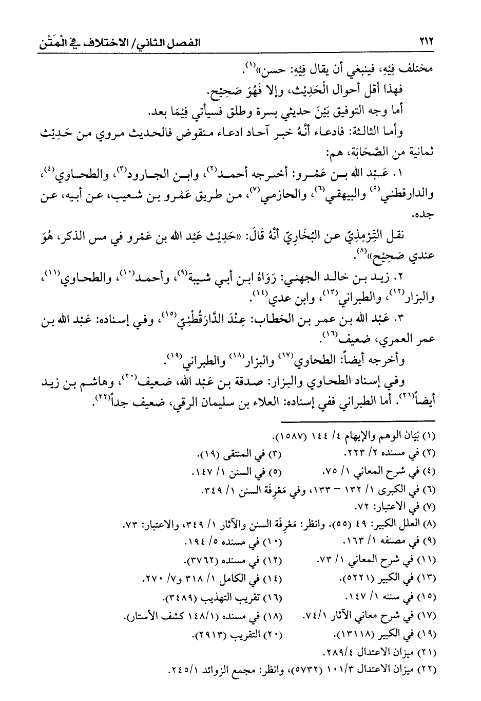 1 - عَبْد الله بن عَمْرو: أخرجه أحمد (¬2)،وابن الجارود (¬3)،والطحاوي (¬4)،والدارقطني (¬5) والبيهقي (¬6)، والحازمي (¬7)، من طريق عَمْرو بن شعيب، عن أبيه، عن جده.