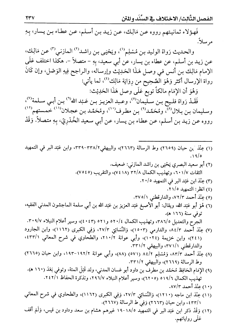والحديث رَواهُ الوليد بن مُسْلِم (¬1)، ويَحْيَى بن راشد (¬2) المازني (¬3) عن مَالِك، عن زيد بن أسلم، عن عطاء بن يسار، عن أبي سعيد، بِهِ - متصلاً -. هكذا اختلف عَلَى الإمام مَالِك بن أنس في وصل هَذَا الحَدِيْث وإرساله، والراجح فِيهِ الوَصْل، وإن كَانَ رواة الإرسال أكثر وَهُوَ الصَّحِيح من رِوَايَة مَالِك (¬4)، لما يأتي: