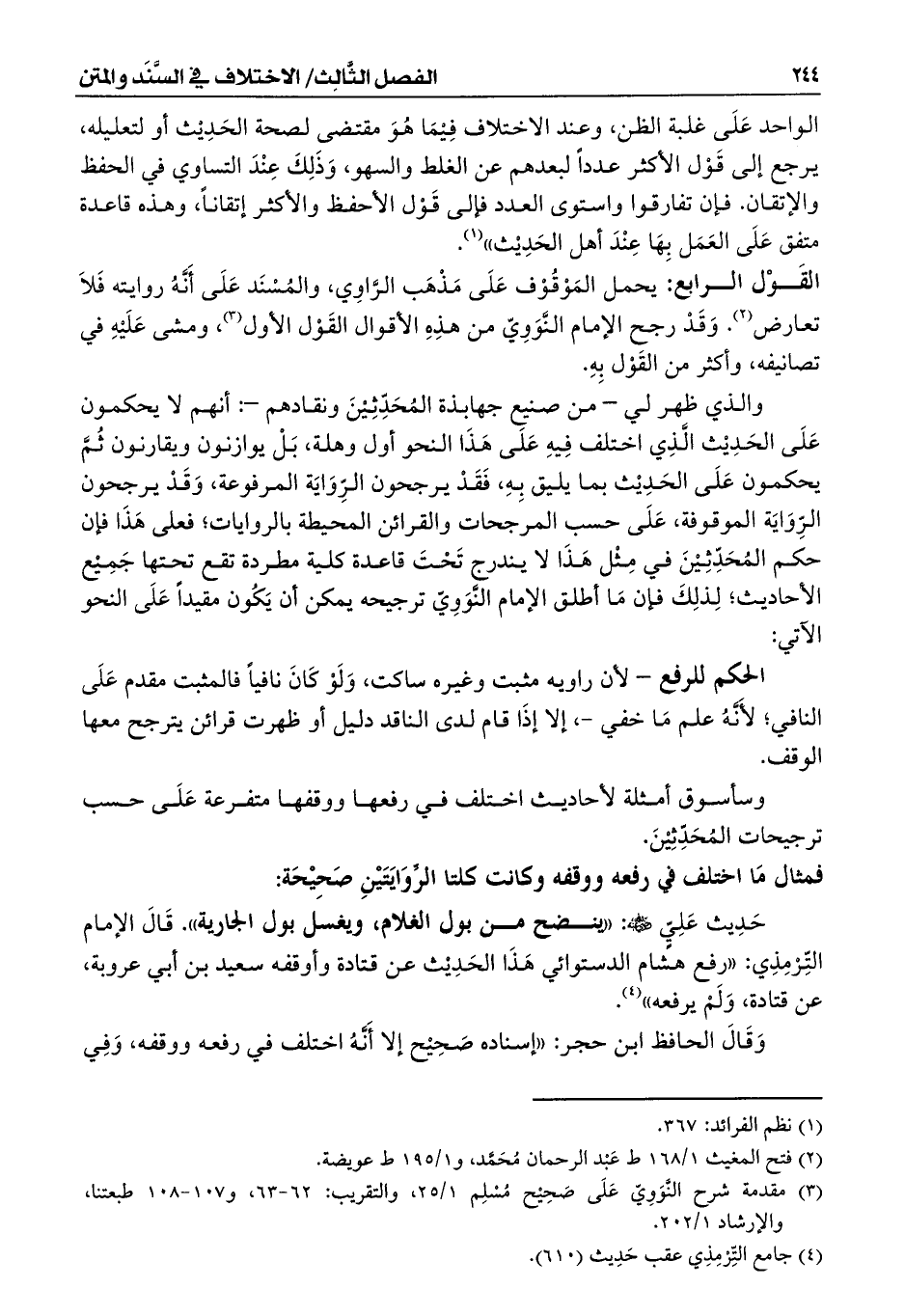 القَوْل الرابع: يحمل المَوْقُوْف عَلَى مَذْهَب الرَّاوِي، والمُسْنَد عَلَى أَنَّهُ روايته فَلاَ تعارض (¬2). وَقَدْ رجح الإمام النَّوَوِيّ من هذِهِ الأقوال القَوْل الأول (¬3)، ومشى عَلَيْهِ في تصانيفه، وأكثر من القَوْل بِهِ.