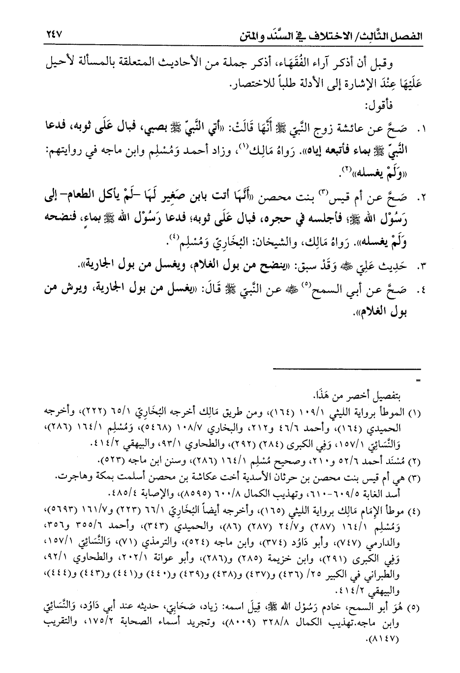 1 - صَحَّ عن عائشة زوج النَّبيّ - صلى الله عليه وسلم - أَنَّهَا قَالَتْ: ((أتي النَّبيّ - صلى الله عليه وسلم - بصبي، فبال عَلَى ثوبه، فدعا النَّبيّ - صلى الله عليه وسلم - بماء فأتبعه إياه)). رَواهُ مَالِك (¬1)، وزاد أحمد وَمُسْلِم وابن ماجه في روايتهم: ((وَلَمْ يغسله)) (¬2).