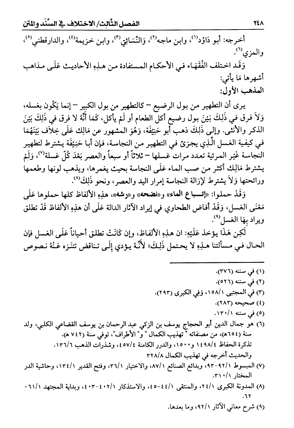 وَقَدْ حملوا: ((إتباع الماء)) و ((نضحه)) و ((رشه))، هذِهِ الألفاظ كلها حملوها عَلَى مَعْنَى الغسل، وَقَدْ أفاض الطحاوي في إيراد الآثار الدالة عَلَى أن هذِهِ الألفاظ قَدْ تطلق ويراد بِهَا الغسل (¬9).