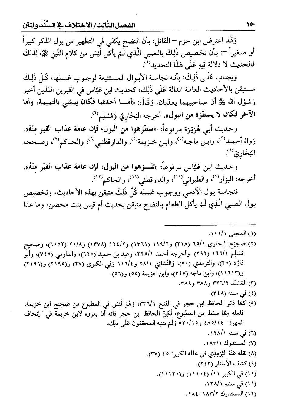 ويجاب عَلَى ذَلِكَ: بأنه نجاسة الأبوال المستتبعة لوجوب غسلها، كُلّ ذَلِكَ مستيقن بالأحاديث العامة الدالة عَلَى ذَلِكَ، كحديث ابن عَبَّاس في القبرين اللذين أخبر رَسُوْل الله - صلى الله عليه وسلم - أن صاحبيهما يعذبان، وَقَالَ: ((أما أحدهما فكان يمشي بالنميمة، وأما الآخر فكان لا يستنْزه من البول)). أخرجه البُخَارِيّ وَمُسْلِم (¬2).