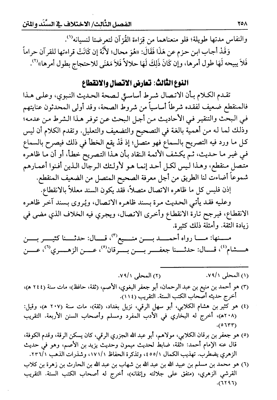 وعليه فقد يأتي الحديث مرة بسند ظاهره الاتصال، ويُروى بسند آخر ظاهره الانقطاع، فيرجح تارة الانقطاع وأخرى الاتصال، ويجري فيه الخلاف الذي مضى في زيادة الثقة. وأمثلة ذلك كثيرة.