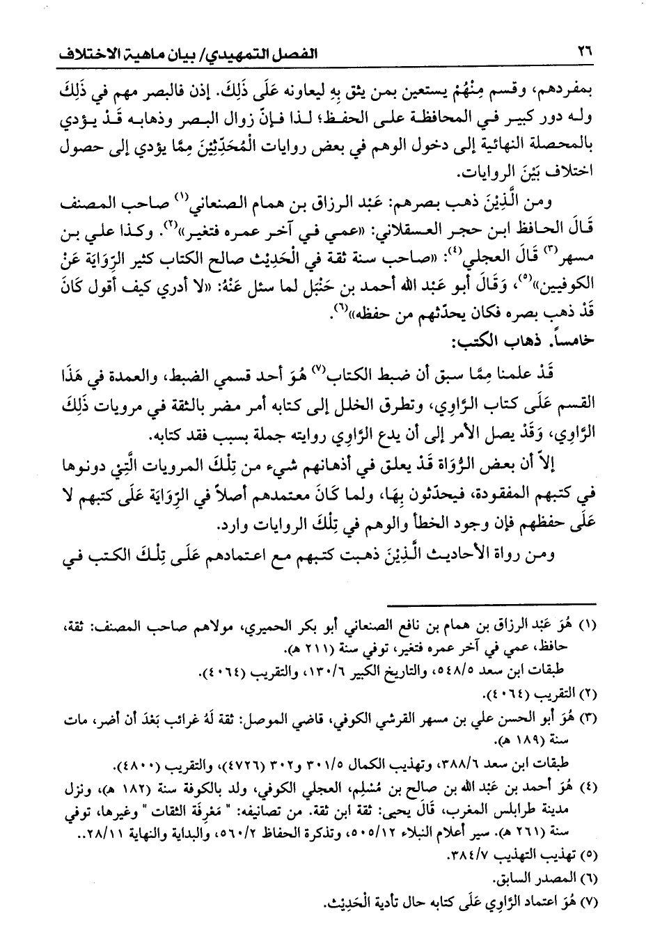 بمفردهم، وقسم مِنْهُمْ يستعين بمن يثق بِهِ ليعاونه عَلَى ذَلِكَ. إذن فالبصر مهم في ذَلِكَ وله دور كبير في المحافظة على الحفظ؛ لذا فإنّ زوال البصر وذهابه قَدْ يؤدي بالمحصلة النهائية إلى دخول الوهم في بعض روايات الْمُحَدِّثِيْنَ مِمَّا يؤدي إلى حصول اختلاف بَيْنَ الروايات.