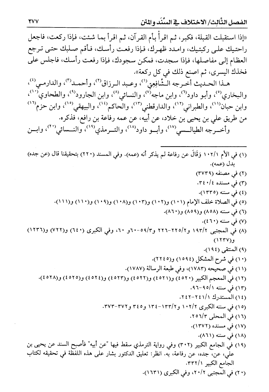 هذا الحديث أخرجه الشَّافِعِيّ (¬1)، وعبد الرزاق (¬2)، وأحمد (¬3)، والدارمي (¬4)، والبخاري (¬5)، وأبو داود (¬6)، وابن ماجه (¬7)، والنسائي (¬8)، وابن الجارود (¬9)، والطحاوي (¬10)، وابن حبان (¬11)، والطبراني (¬12)، والدارقطني (¬13)، والحاكم (¬14)، والبيهقي (¬15)، وابن حزم (¬16) من طريق علي بن يحيى بن خلاد، عن أبيه، عن عمه رفاعة بن رافع، فذكره.