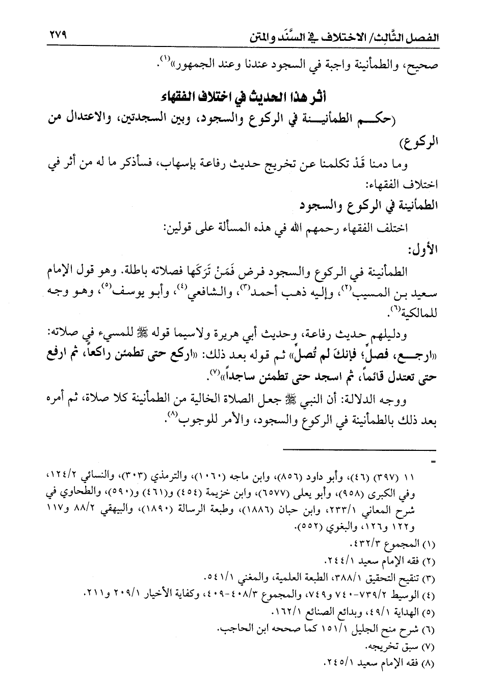 ودليلهم حديث رفاعة، وحديث أبي هريرة ولاسيما قوله - صلى الله عليه وسلم - للمسيء في صلاته: ((ارجع، فصلِّ؛ فإنكَ لم تُصلِّ)) ثم قوله بعد ذلك: ((اركع حتى تطمئن راكعاً، ثم ارفع حتى تعتدل قائماً، ثم اسجد حتى تطمئن ساجداً)) (¬7).