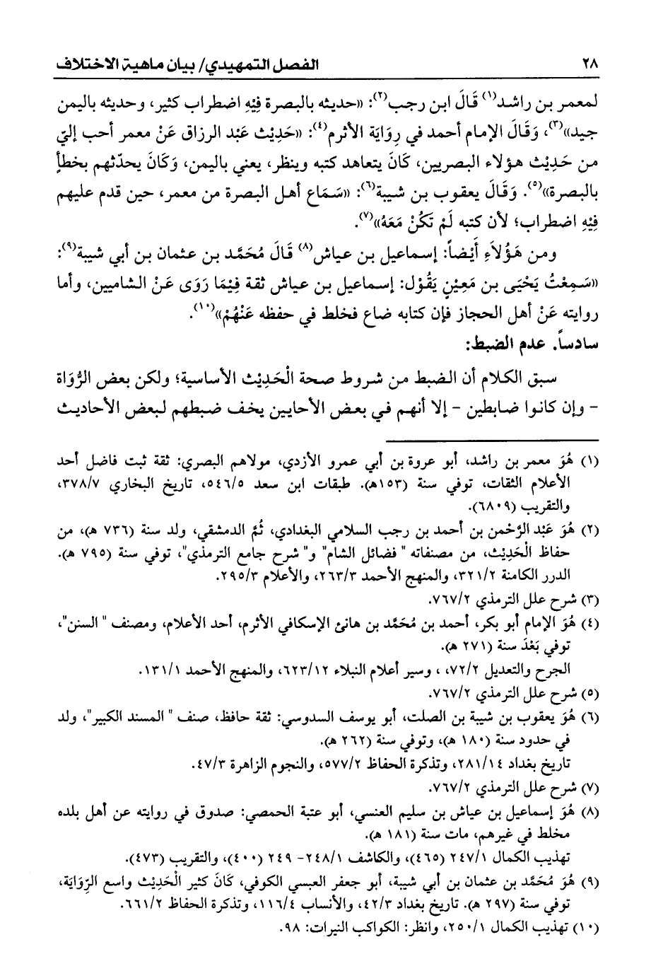 لمعمر بن راشد (¬1) قَالَ ابن رجب (¬2): ((حديثه بالبصرة فِيْهِ اضطراب كثير، وحديثه باليمن جيد)) (¬3)، وَقَالَ الإمام أحمد في رِوَايَة الأثرم (¬4): ((حَدِيْث عَبْد الرزاق عَنْ معمر أحب إليّ من حَدِيْث هؤلاء البصريين، كَانَ يتعاهد كتبه وينظر، يعني باليمن، وَكَانَ يحدّثهم بخطأٍ بالبصرة)) (¬5). وَقَالَ يعقوب بن شيبة (¬6): ((سَمَاع أهل البصرة من معمر، حين قدم عليهم فِيْهِ اضطراب؛ لأن كتبه لَمْ تَكُنْ مَعَهُ)) (¬7).