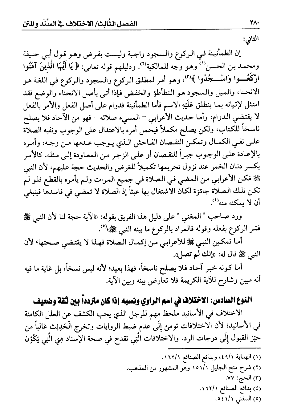 إن الطمأنينة في الركوع والسجود واجبة وليست بفرض وهو قول أبي حنيفة ومحمد بن الحسن (¬1) وهو وجه للمالكية (¬2). ودليلهم قوله تعالى: {يَا أَيُّهَا الَّذِينَ آمَنُوا ارْكَعُوا وَاسْجُدُوا} (¬3)، وهو أمر لمطلق الركوع والسجود والركوع في اللغة هو الانحناء والميل والسجود هو التطأطؤ والخفض فإذا أتى بأصل الانحناء والوضع فقد امتثل لإتيانه بما ينطلق عَلَيْهِ الاسم فأما الطمأنينة فدوام على أصل الفعل والأمر بالفعل لا يقتضي الدوام، وأما حديث الأعرابي - المسيء صلاته - فهو من الآحاد فلا يصلح ناسخاً للكتاب، ولكن يصلح مكملاً فيحمل أمره بالاعتدال على الوجوب ونفيه الصلاة على نفي الكمال وتمكن النقصان الفاحش الذي يوجب عدمها من وجه، وأمره بالإعادة على الوجوب جبراً للنقصان أو على الزجر من المعاودة إلى مثله. كالأمر بكسر دنان الخمر عند نزول تحريمها تكميلاً للغرض والحديث حجة عليهم، لأن النبي - صلى الله عليه وسلم - مَكن الأعرابي من المضي في الصلاة في جميع المرات ولم يأمره بالقطع فلو لم تكن تلك الصلاة جائزة لكان الاشتغال بها عبثاً إذ الصلاة لا تمضي في فاسدها فينبغي أن لا يمكنه منه (¬4).