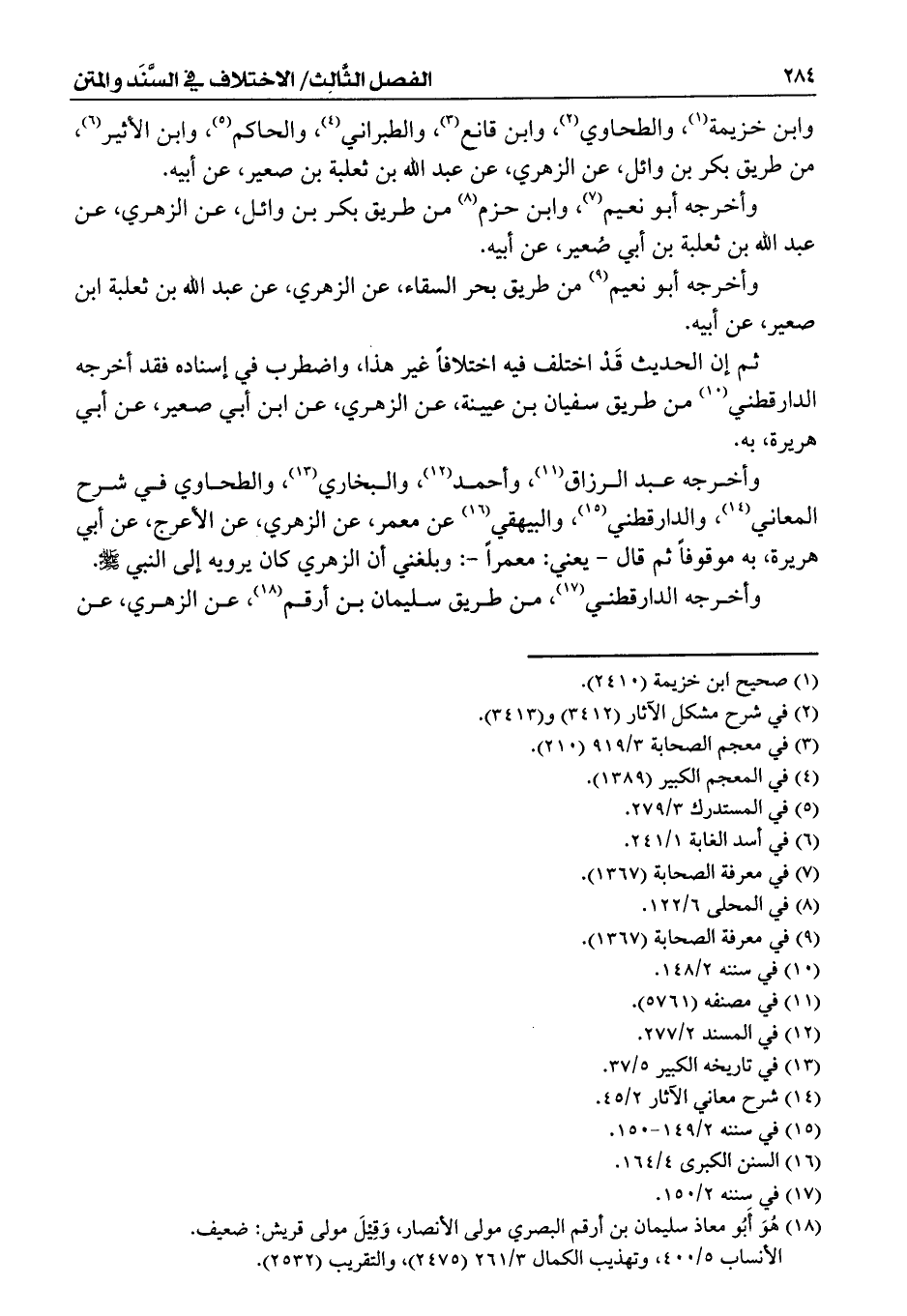 وابن خزيمة (¬1)، والطحاوي (¬2)، وابن قانع (¬3)، والطبراني (¬4)، والحاكم (¬5)، وابن الأثير (¬6)، من طريق بكر بن وائل، عن الزهري، عن عبد الله بن ثعلبة بن صعير، عن أبيه.