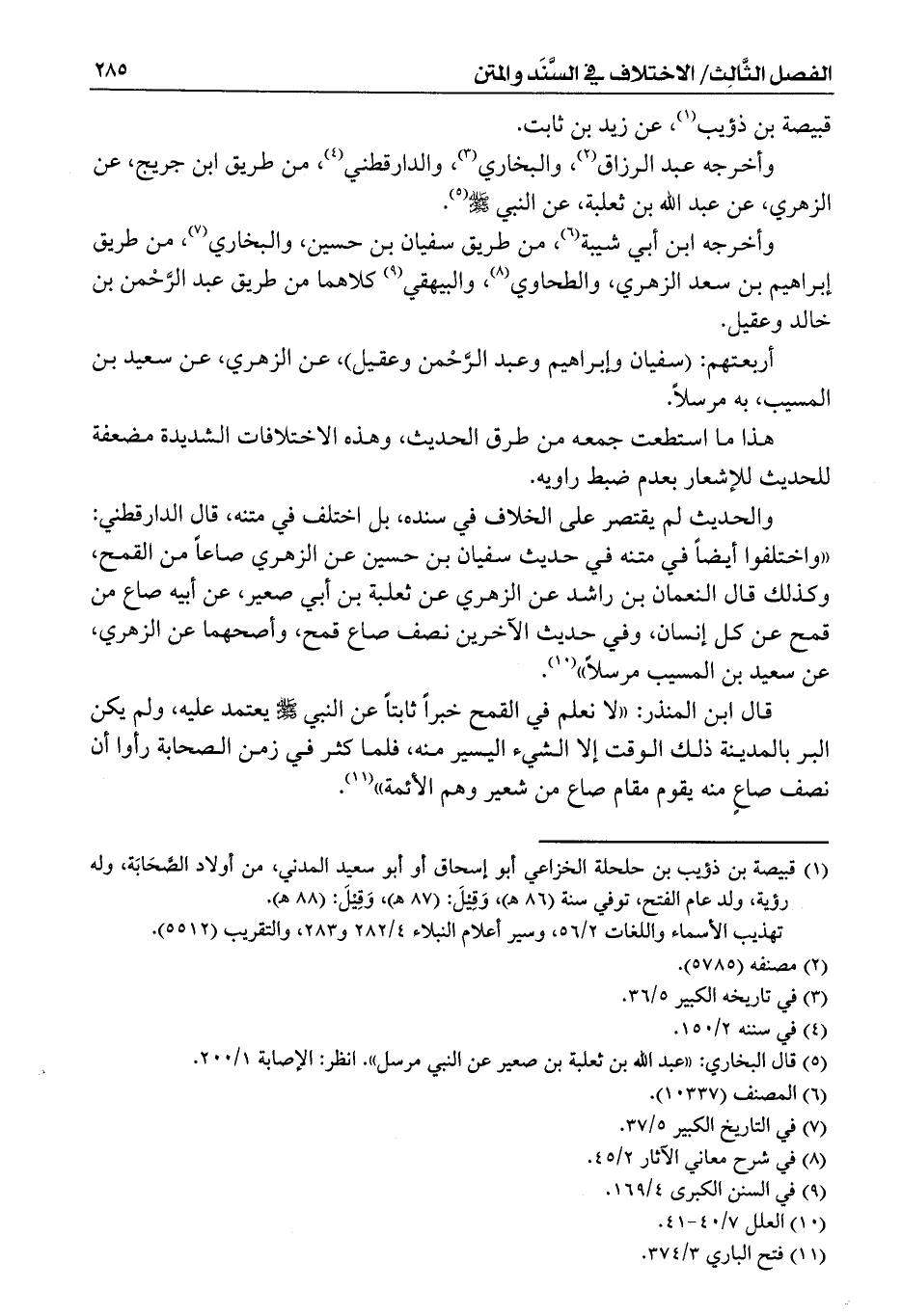 والحديث لم يقتصر على الخلاف في سنده، بل اختلف في متنه، قال الدارقطني: ((واختلفوا أيضاً في متنه في حديث سفيان بن حسين عن الزهري صاعاً من القمح، وكذلك قال النعمان بن راشد عن الزهري عن ثعلبة بن أبي صعير، عن أبيه صاع من قمح عن كل إنسان، وفي حديث الآخرين نصف صاع قمح، وأصحهما عن الزهري، عن سعيد بن المسيب مرسلاً)) (¬10).