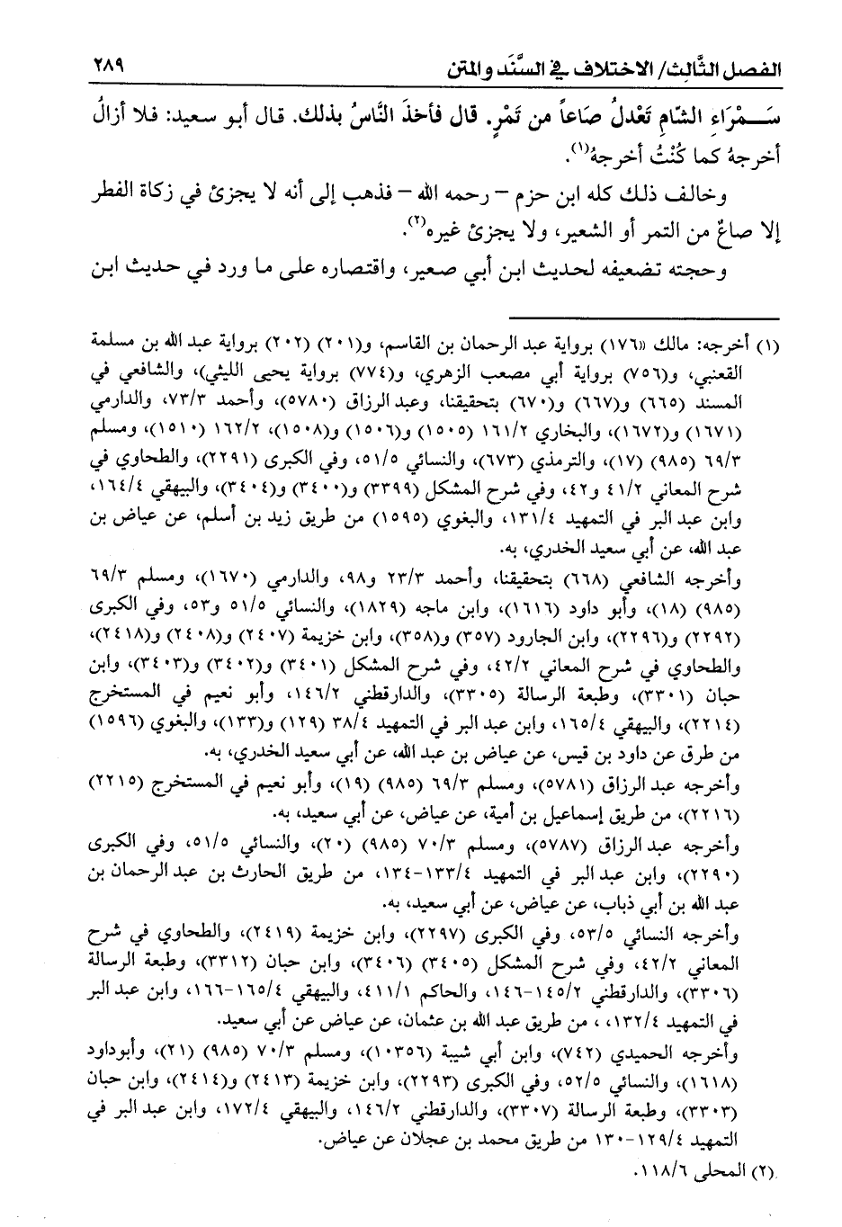 وخالف ذلك كله ابن حزم - رحمه الله - فذهب إلى أنه لا يجزئ في زكاة الفطر إلا صاعٌ من التمر أو الشعير، ولا يجزئ غيره (¬2).