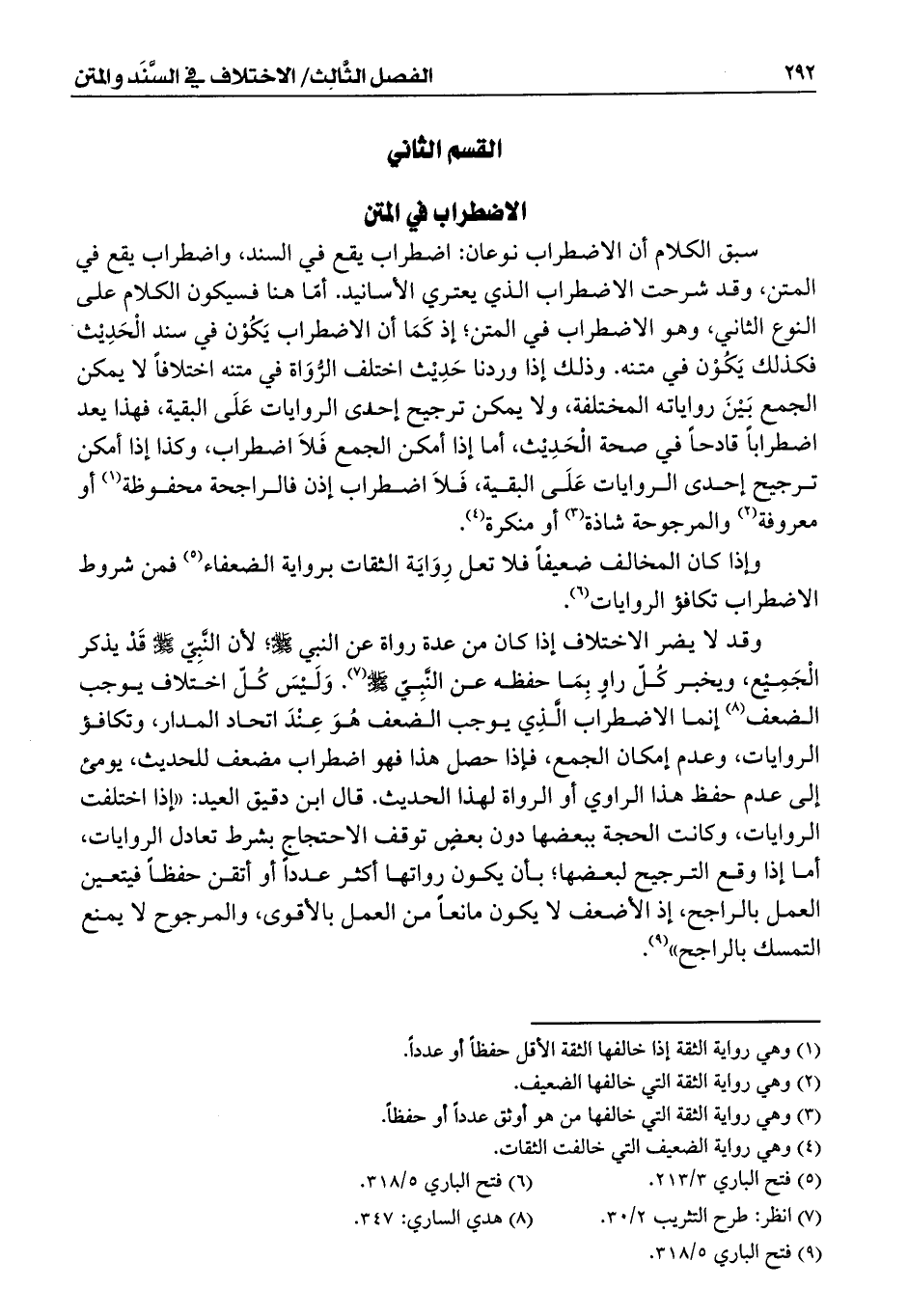 سبق الكلام أن الاضطراب نوعان: اضطراب يقع في السند، واضطراب يقع في المتن، وقد شرحت الاضطراب الذي يعتري الأسانيد. أمّا هنا فسيكون الكلام على النوع الثاني، وهو الاضطراب في المتن؛ إذ كَمَا أن الاضطراب يَكُوْن في سند الْحَدِيْث فكذلك يَكُوْن في متنه. وذلك إذا وردنا حَدِيْث اختلف الرُّوَاة في متنه اختلافاً لا يمكن الجمع بَيْنَ رواياته المختلفة، ولا يمكن ترجيح إحدى الروايات عَلَى البقية، فهذا يعد اضطراباً قادحاً في صحة الْحَدِيْث، أما إذا أمكن الجمع فَلاَ اضطراب، وكذا إذا أمكن ترجيح إحدى الروايات عَلَى البقية، فَلاَ اضطراب إذن فالراجحة محفوظة (¬1) أو معروفة (¬2) والمرجوحة شاذة (¬3) أو منكرة (¬4).
