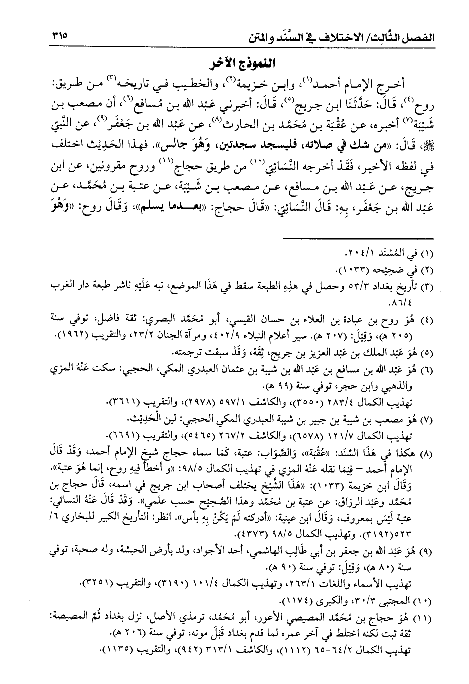 أخرج الإمام أحمد (¬1)، وابن خزيمة (¬2)، والخطيب في تاريخه (¬3) من طريق: روح (¬4)، قَالَ: حَدَّثَنَا ابن جريج (¬5)، قَالَ: أخبرني عَبْد الله بن مُسافع (¬6)، أن مصعب بن شَيْبَة (¬7) أخبره، عن عُقْبَة بن مُحَمَّد بن الحارث (¬8)، عن عَبْد الله بنجَعْفَر (¬9)، عن النَّبيّ - صلى الله عليه وسلم -، قَالَ: ((من شك في صلاته، فليسجد سجدتين، وَهُوَ جالس)). فهذا الحَدِيْث اختلف في لفظه الأخير، فَقَدْ أخرجه النَّسَائِيّ (¬10) من طريق حجاج (¬11) وروح مقرونين، عن ابن جريج، عن عَبْد الله بن مسافع، عن مصعب بن شَيْبَة، عن عتبة بن مُحَمَّد، عن عَبْد الله بن جَعْفَر، بِهِ: قَالَ النَّسَائِيّ: ((قَالَ حجاج: ((بعدما يسلم))، وَقَالَ روح: ((وَهُوَ