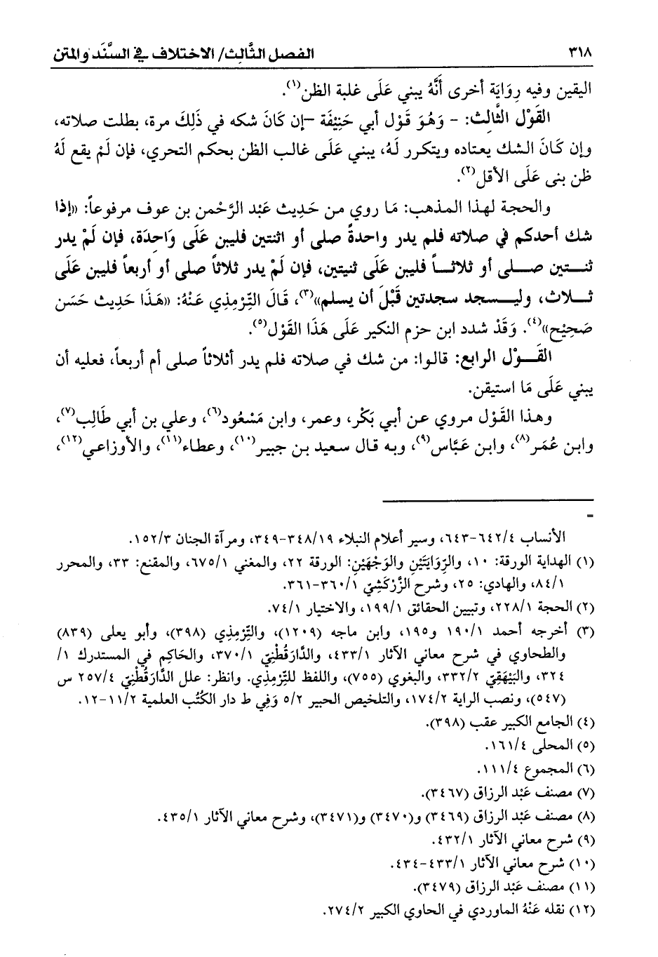 والحجة لهذا المذهب: مَا روي من حَدِيث عَبْد الرحمان بن عوف مرفوعاً: ((إذا شك أحدكم في صلاته فلم يدر واحدةً صلى أو اثنتين فليبن عَلَى وَاحِدَة، فإن لَمْ يدر ثنتين صلى أو ثلاثاً فليبن عَلَى ثنيتين، فإن لَمْ يدر ثلاثاً صلى أو أربعاً فليبن عَلَى ثلاث، وليسجد سجدتين قَبْلَ أن يسلم)) (¬3)، قَالَ التِّرْمِذِي عَنْهُ: ((هَذَا حَدِيث حَسَن صَحِيْح)) (¬4). وَقَدْ شدد ابن حزم النكير عَلَى هَذَا القَوْل (¬5).
