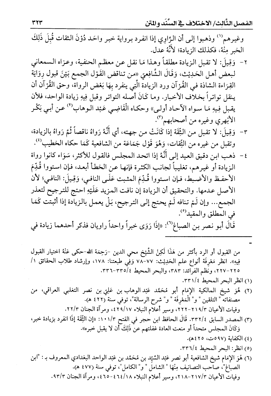 (¬3) المصدر السابق 4/ 332. قَالَ الحافظ ابن حجر في الفتح 3/ 101: ((إن الثِّقَة إذَا انفرد بزيادة خبر، وَكَانَ المجلس متحداً أو منعت العادة غفلتهم عن ذَلِكَ أن لا يقبل خبره)).
