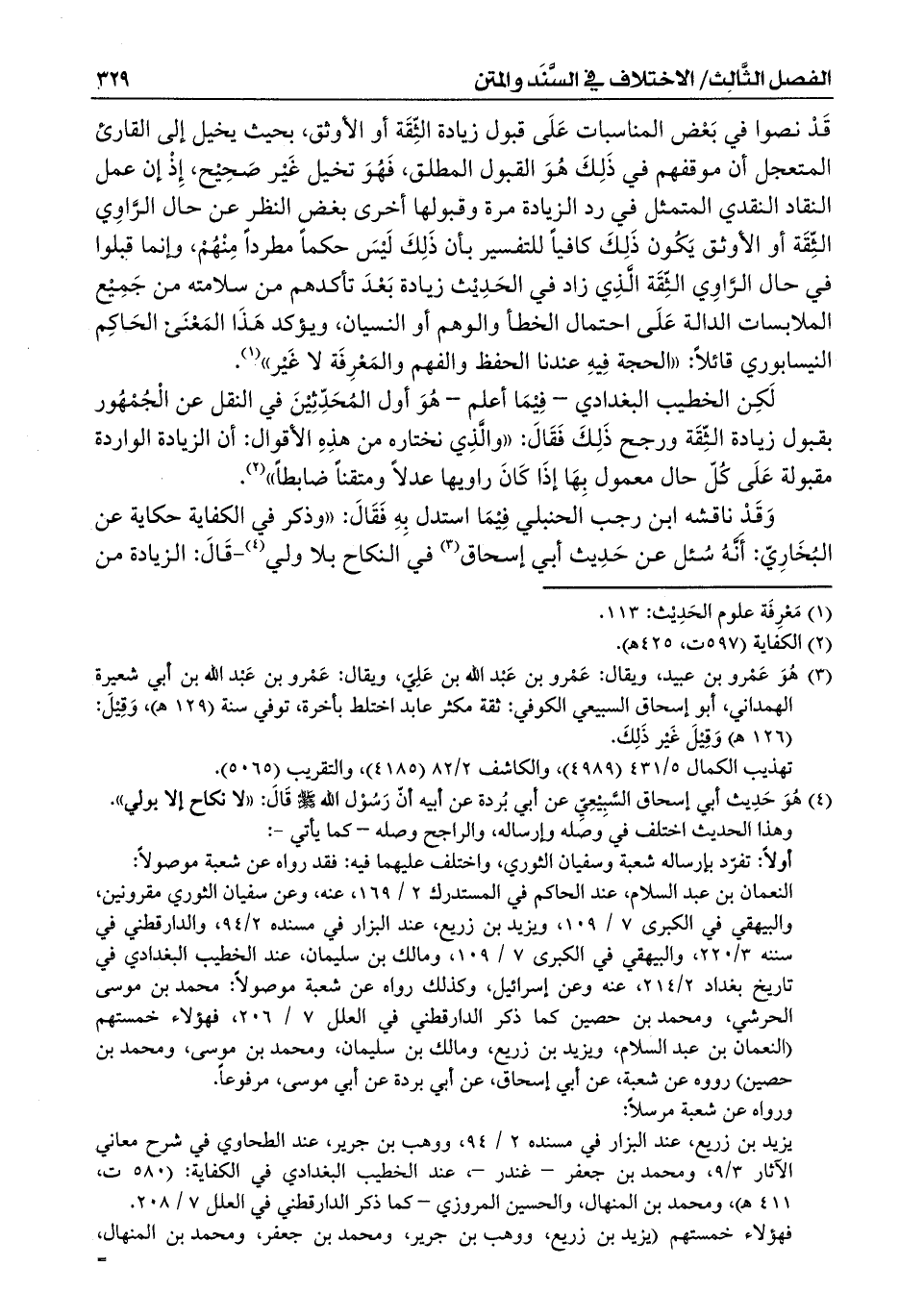 لَكِن الخطيب البغدادي - فِيْمَا أعلم - هُوَ أول المُحَدِّثِيْنَ في النقل عن الْجُمْهُور بقبول زيادة الثِّقَة ورجح ذَلِكَ فَقَالَ: ((والَّذِي نختاره من هذِهِ الأقوال: أن الزيادة الواردة مقبولة عَلَى كُلّ حال معمول بِهَا إذَا كَانَ راويها عدلاً ومتقناً ضابطاً)) (¬2).