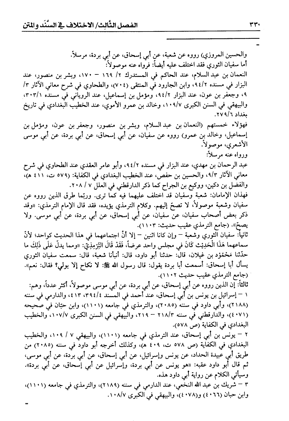 فهذان الإمامان: شعبة وسفيان قد اختلف عليهما فيه كما ترى. وربّما طرق الذين رووه عن سفيان وشعبة موصولاً، لا تصحّ إليهم. وكلام الترمذي يؤيده، فقد قال الإمام الترمذي: ((وقد ذكر بعض أصحاب سفيان، عن سفيان، عن أبي إسحاق، عن أبي بردة، عن أبي موسى. ولا يصحّ)). (جامع الترمذي عقيب حديث: 1103).