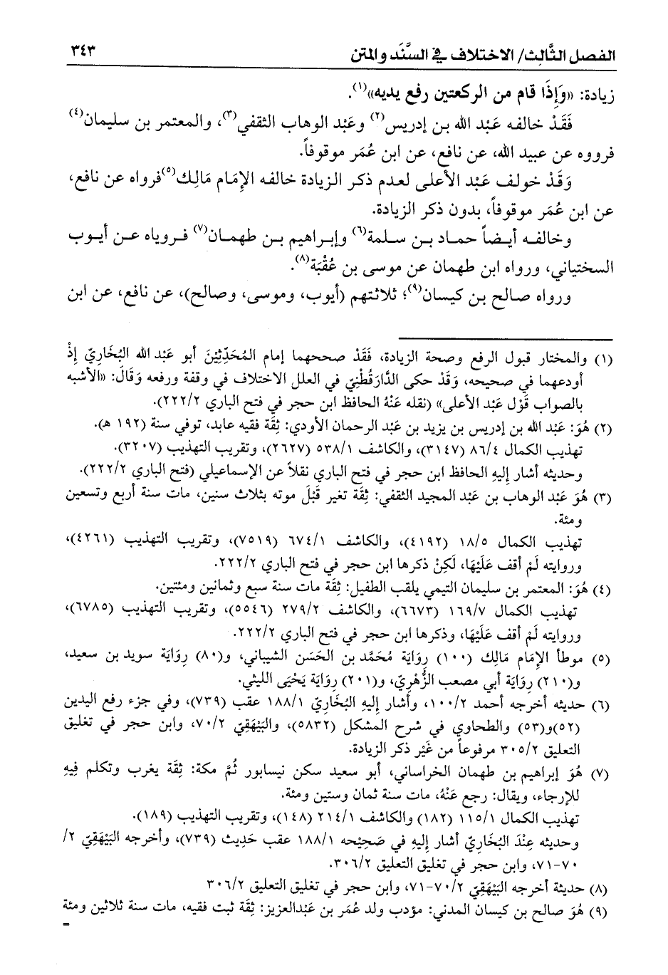 (¬1) والمختار قبول الرفع وصحة الزيادة، فَقَدْ صححهما إمام المُحَدِّثِيْنَ أبو عَبْد الله البُخَارِيّ إِذْ أودعهما في صحيحه، وَقَدْ حكى الدَّارَقُطْنِيّ في العلل الاختلاف في وقفة ورفعه وَقَالَ: ((الأشبه بالصواب قَوْل عَبْد الأعلى)) (نقله عَنْهُ الحافظ ابن حجر في فتح الباري 2/ 222).