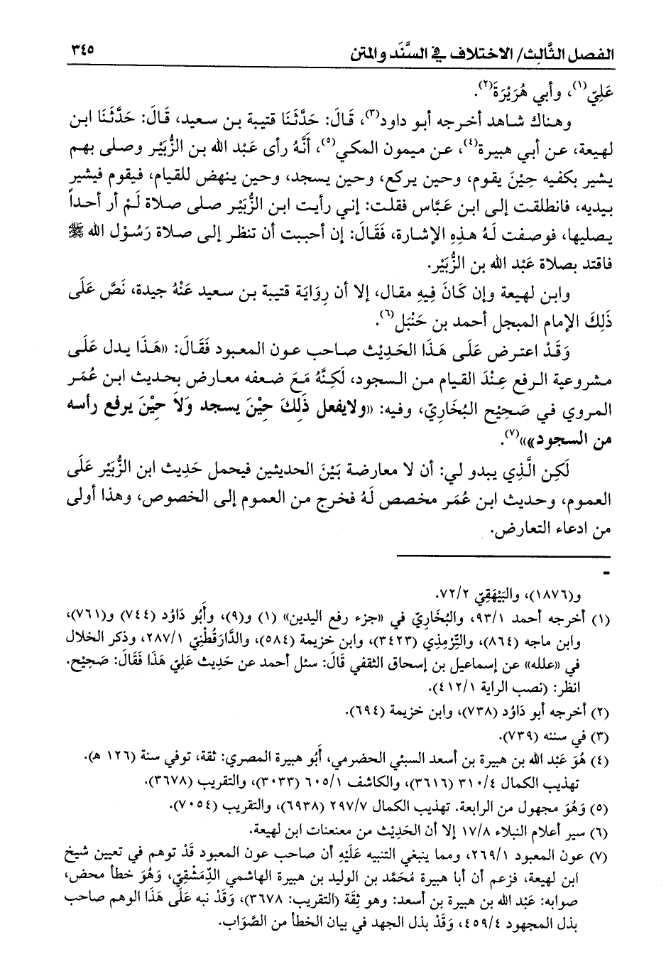 وَقَدْ اعترض عَلَى هَذَا الحَدِيْث صاحب عون المعبود فَقَالَ: ((هَذَا يدل عَلَى مشروعية الرفع عِنْدَ القيام من السجود، لَكِنَّهُ مَعَ ضعفه معارض بحديث ابن عُمَر المروي في صَحِيْح البُخَارِيّ، وفيه: ((ولايفعل ذَلِكَ حِيْنَ يسجد وَلاَ حِيْنَ يرفع رأسه من السجود)))) (¬7).