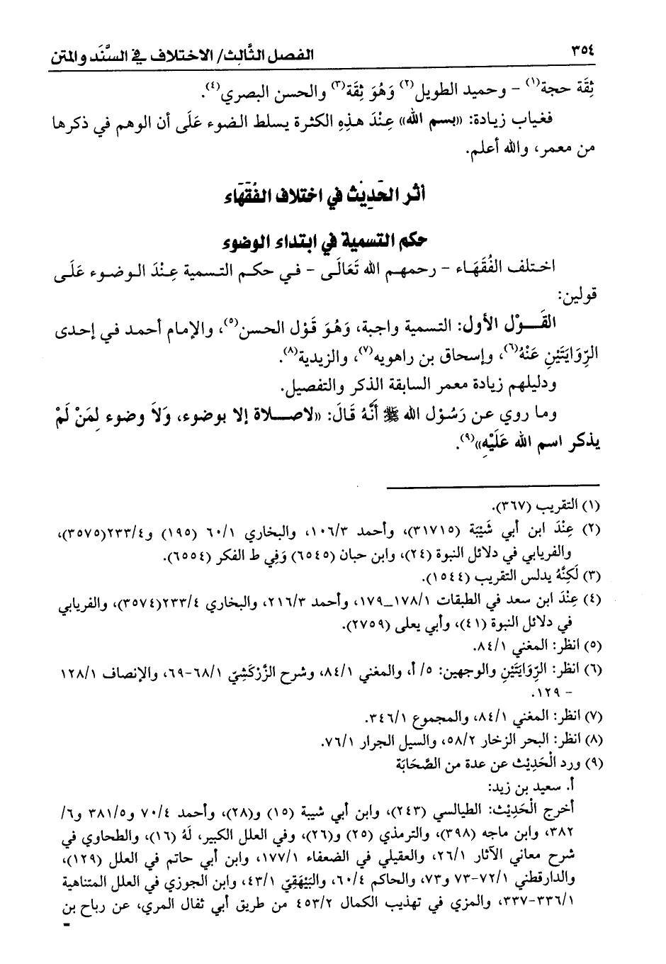 وما روي عن رَسُوْل الله - صلى الله عليه وسلم - أَنَّهُ قَالَ: ((لاصلاة إلا بوضوء، وَلاَ وضوء لِمَنْ لَمْ يذكر اسم الله عَلَيْهِ)) (¬9).