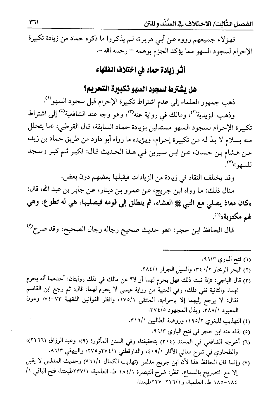 وذهب الزيدية (¬2)، ومالك في رواية عنه (¬3)، وهو وجه عند الشافعية (¬4) إلى اشتراط تكبيرة الإحرام لسجود السهو مستدلين بزيادة حماد السابقة، قال القرطبي: ((ما يتحلل منه بسلام لابد له من تكبيرة إحرام، ويؤيده ما رواه أبو داود من طريق حماد بن زيد، عن هشام بن حسان، عن ابن سيرين في هذا الحديث قال: فكبر ثم كبر وسجد للسهو)) (¬5).