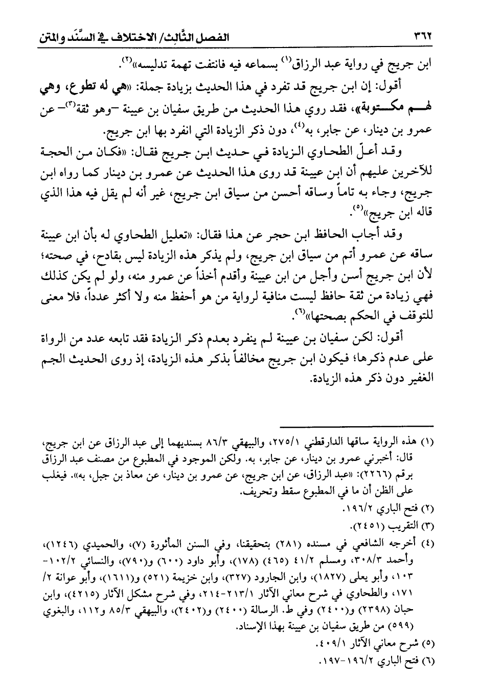 أقول: لكن سفيان بن عيينة لم ينفرد بعدم ذكر الزيادة فقد تابعه عدد من الرواة على عدم ذكرها؛ فيكون ابن جريج مخالفاً بذكر هذه الزيادة، إذ روى الحديث الجم الغفير دون ذكر هذه الزيادة.