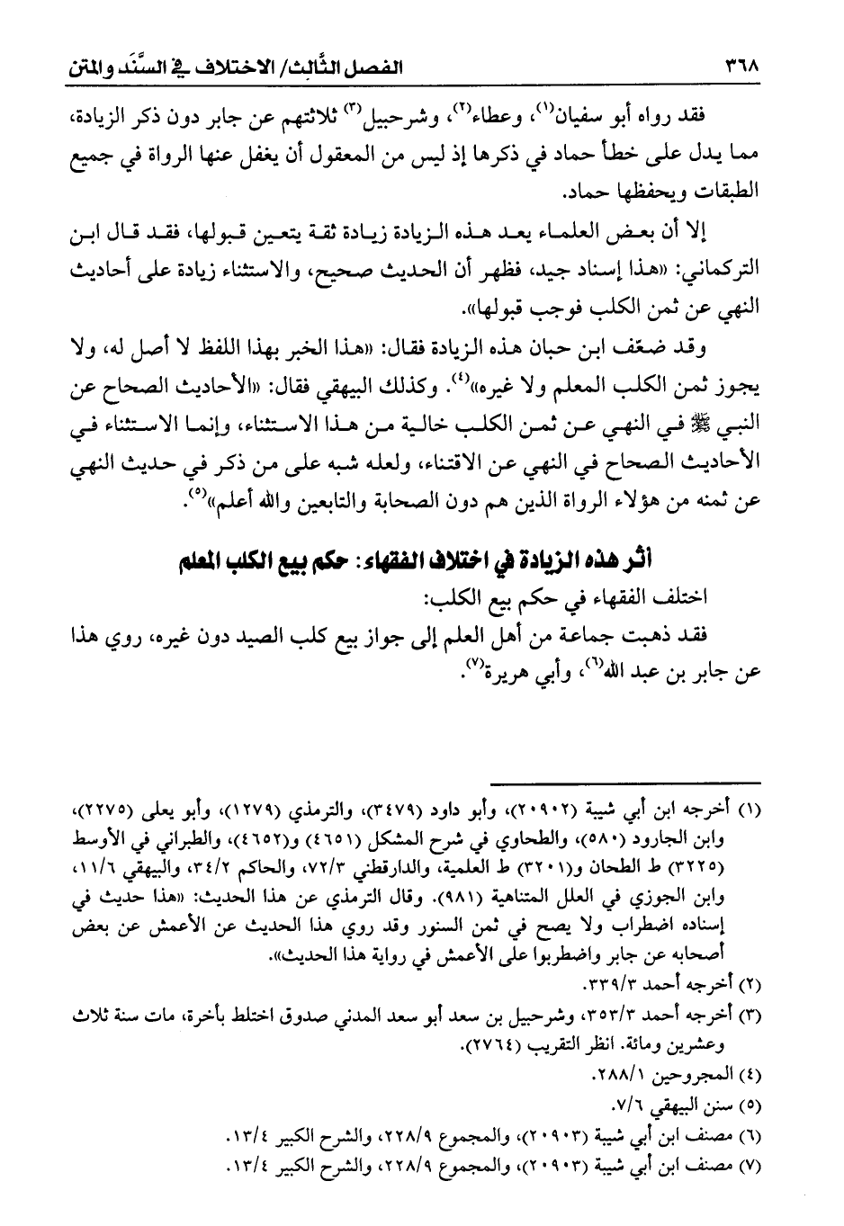 وقد ضعّف ابن حبان هذه الزيادة فقال: ((هذا الخبر بهذا اللفظ لا أصل له، ولا يجوز ثمن الكلب المعلم ولا غيره)) (¬4). وكذلك البيهقي فقال: ((الأحاديث الصحاح عن النبي - صلى الله عليه وسلم - في النهي عن ثمن الكلب خالية من هذا الاستثناء، وإنما الاستثناء في الأحاديث الصحاح في النهي عن الاقتناء، ولعله شبه على من ذكر في حديث النهي عن ثمنه من هؤلاء الرواة الذين هم دون الصحابة والتابعين والله أعلم)) (¬5).