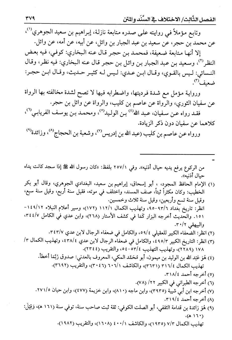 إلا أنها متابعة ضعيفة، فمحمد بن حجر قال عنه البخاري: كوفي، فيه بعض النظر (¬2)، وسعيد بن عبد الجبار بن وائل بن حجر قال عنه البخاري: فيه نظر، وقال النسائي: ليس بالقوي، وقال ابن عدي: ليس له كثير حديث، وقال ابن حجر: ضعيف (¬3).
