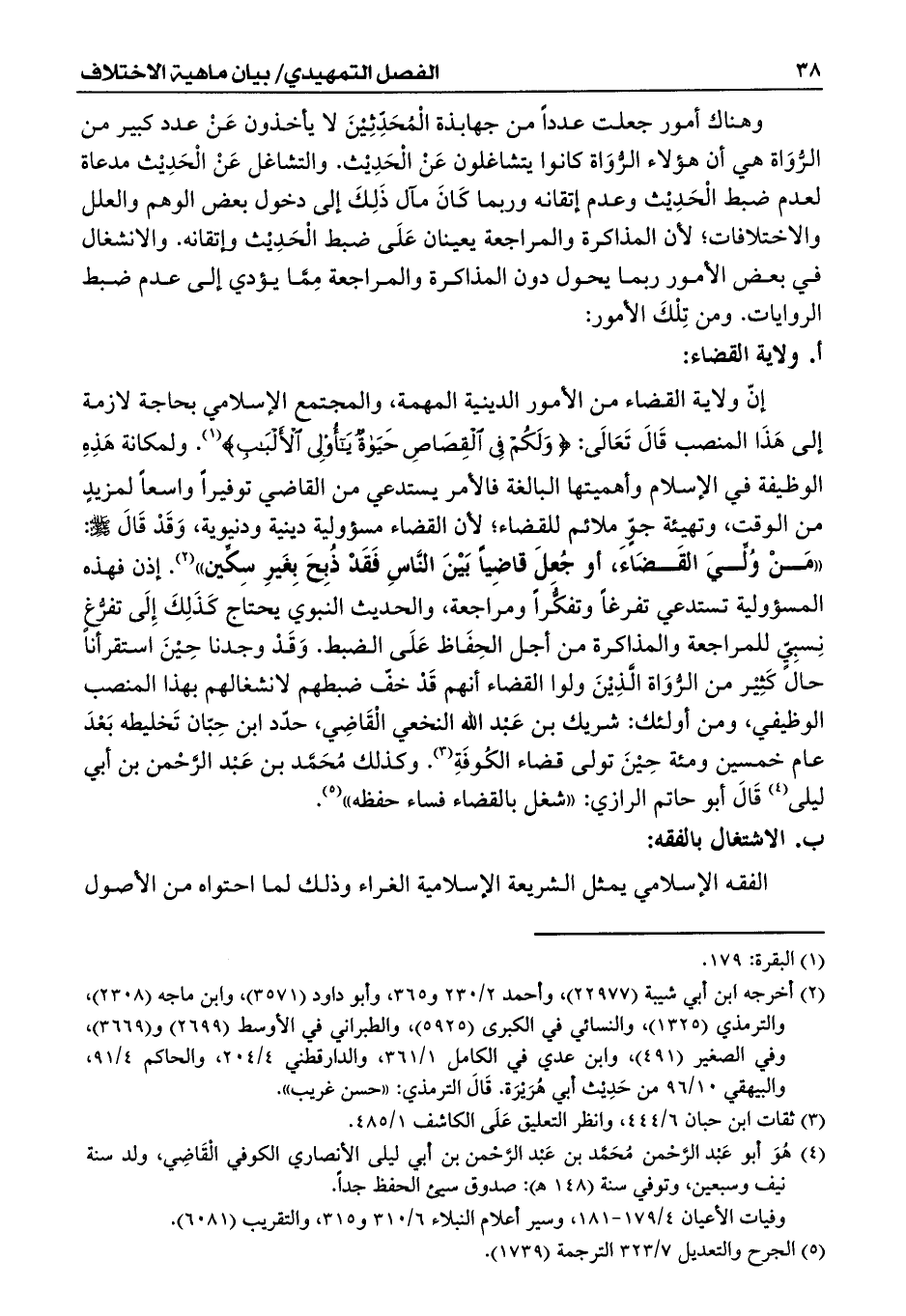إنّ ولاية القضاء من الأمور الدينية المهمة، والمجتمع الإسلامي بحاجة لازمة إلى هَذَا المنصب قَالَ تَعَالَى: {وَلَكُمْ فِي الْقِصَاصِ حَيَاةٌ يَا أُولِي الأَلْبَابِ} (¬1). ولمكانة هَذِهِ الوظيفة في الإسلام وأهميتها البالغة فالأمر يستدعي من القاضي توفيراً واسعاً لمزيدٍ من الوقت، وتهيئة جوٍّ ملائم للقضاء؛ لأن القضاء مسؤولية دينية ودنيوية، وَقَدْ قَالَ - صلى الله عليه وسلم -: ((مَنْ وُلِّيَ القَضَاءَ، أو جُعِلَ قاضِياً بَيْنَ النَّاسِ فَقَدْ ذُبِحَ بِغَيرِ سِكِّين)) (¬2). إذن فهذه المسؤولية تستدعي تفرغاً وتفكُّراً ومراجعة، والحديث النبوي يحتاج كَذَلِكَ إِلَى تفرُّغٍ نِسبِيٍّ للمراجعة والمذاكرة من أجل الحِفَاظ عَلَى الضبط. وَقَدْ وجدنا حِيْنَ استقرأنا حال كَثِيْر من الرُّوَاة الَّذِيْنَ ولوا القضاء أنهم قَدْ خفّ ضبطهم لانشغالهم بهذا المنصب الوظيفي، ومن أولئك: شريك بن عَبْد الله النخعي الْقَاضِي، حدّد ابن حِبّان تَخليطه بَعْدَ عام خمسين ومئة حِيْنَ تولى قضاء الكُوفَةِ (¬3). وكذلك مُحَمَّد بن عَبْد الرحمان بن أبي ليلى (¬4) قَالَ أبو حاتم الرازي: ((شغل بالقضاء فساء حفظه)) (¬5).