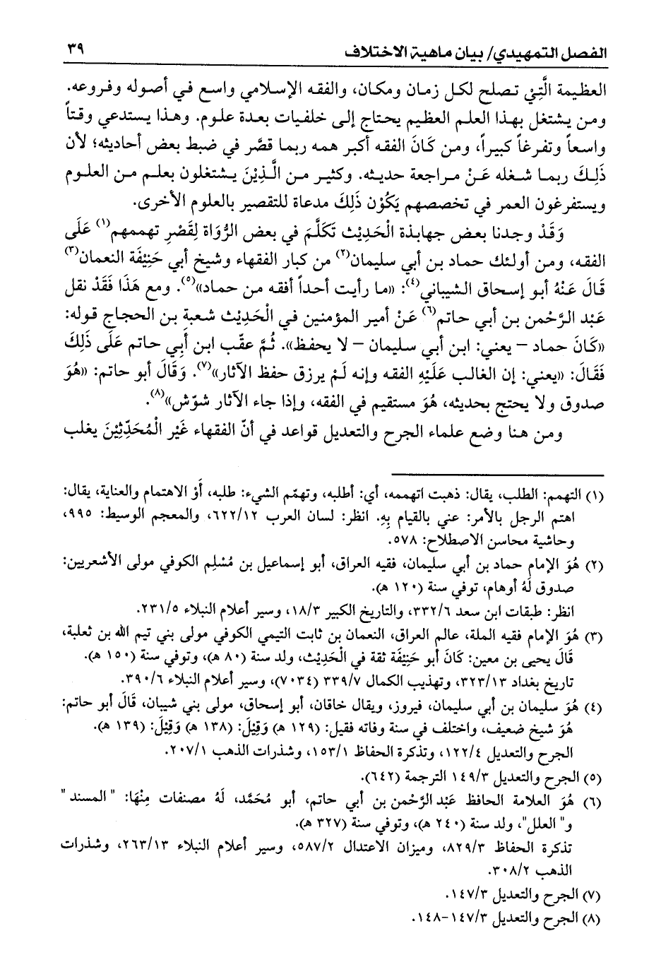 وَقَدْ وجدنا بعض جهابذة الْحَدِيْث تَكَلَّمَ في بعض الرُّوَاة لِقَصْرِ تهممهم (¬1) عَلَى الفقه، ومن أولئك حماد بن أبي سليمان (¬2) من كبار الفقهاء وشيخ أبي حَنِيْفَة النعمان (¬3) قَالَ عَنْهُ أبو إسحاق الشيباني (¬4): ((ما رأيت أحداً أفقه من حماد)) (¬5). ومع هَذَا فَقَدْ نقل عَبْد الرحمان بن أبي حاتم (¬6) عَنْ أمير المؤمنين في الْحَدِيْث شعبة بن الحجاج قوله: ((كَانَ حماد - يعني: ابن أبي سليمان - لا يحفظ)). ثُمَّ عقّب ابن أَبِي حاتم عَلَى ذَلِكَ فَقَالَ: