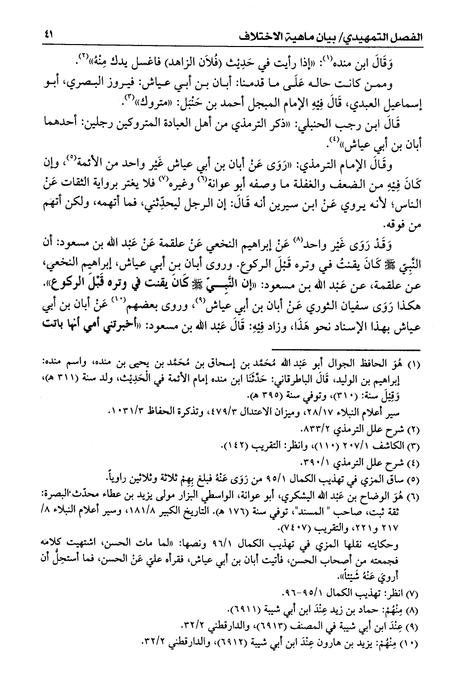 وَقَدْ رَوَى غَيْر واحد (¬8) عَنْ إبراهيم النخعي عَنْ علقمة عَنْ عَبْد الله بن مسعود: أن النَّبِيّ - صلى الله عليه وسلم - كَانَ يقنتُ في وتره قَبْلَ الركوع. وروى أبان بن أبي عياش، إبراهيم النخعي، عن علقمة، عن عَبْد الله بن مسعود: ((إن النَّبِيّ - صلى الله عليه وسلم - كَانَ يقنت في وتره قَبْلَ الركوع)). هكذا رَوَى سفيان الثوري عَنْ أبان بن أبي عياش (¬9)، وروى بعضهم (¬10) عَنْ أبان بن أبي عياش بهذا الإسناد نحو هَذَا، وزاد فِيْهِ: قَالَ عَبْد الله بن مسعود: