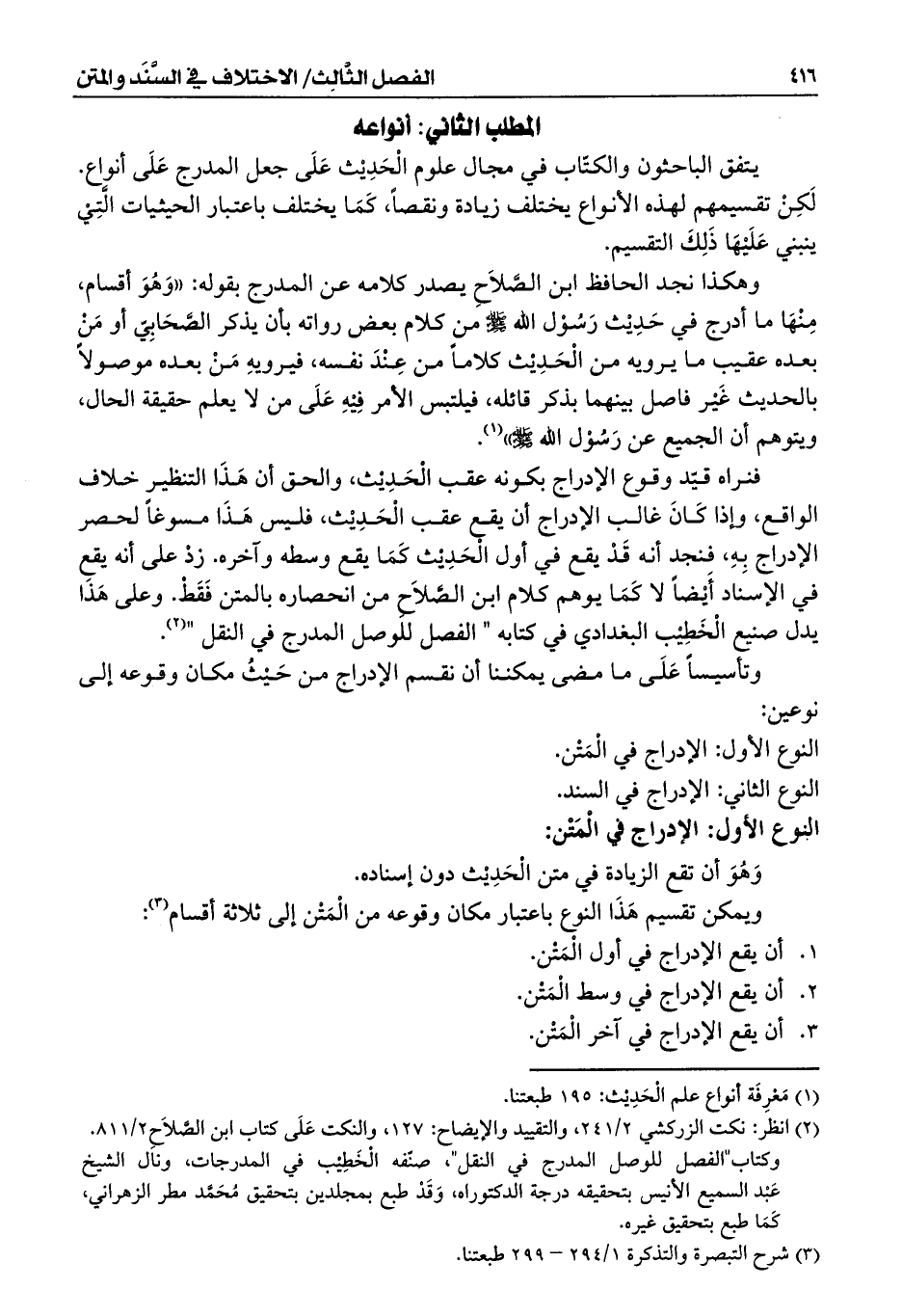 فنراه قيّد وقوع الإدراج بكونه عقب الْحَدِيْث، والحق أن هَذَا التنظير خلاف الواقع، وإذا كَانَ غالب الإدراج أن يقع عقب الْحَدِيْث، فليس هَذَا مسوغاً لحصر الإدراج بِهِ، فنجد أنه قَدْ يقع في أول الْحَدِيْث كَمَا يقع وسطه وآخره. زدْ على أنه يقع في الإسناد أَيْضاً لا كَمَا يوهم كلام ابن الصَّلاَحِ من انحصاره بالمتن فَقَطْ. وعلى هَذَا يدل صنيع الْخَطِيْب البغدادي في كتابه "الفصل للوصل المدرج في النقل" (¬2).