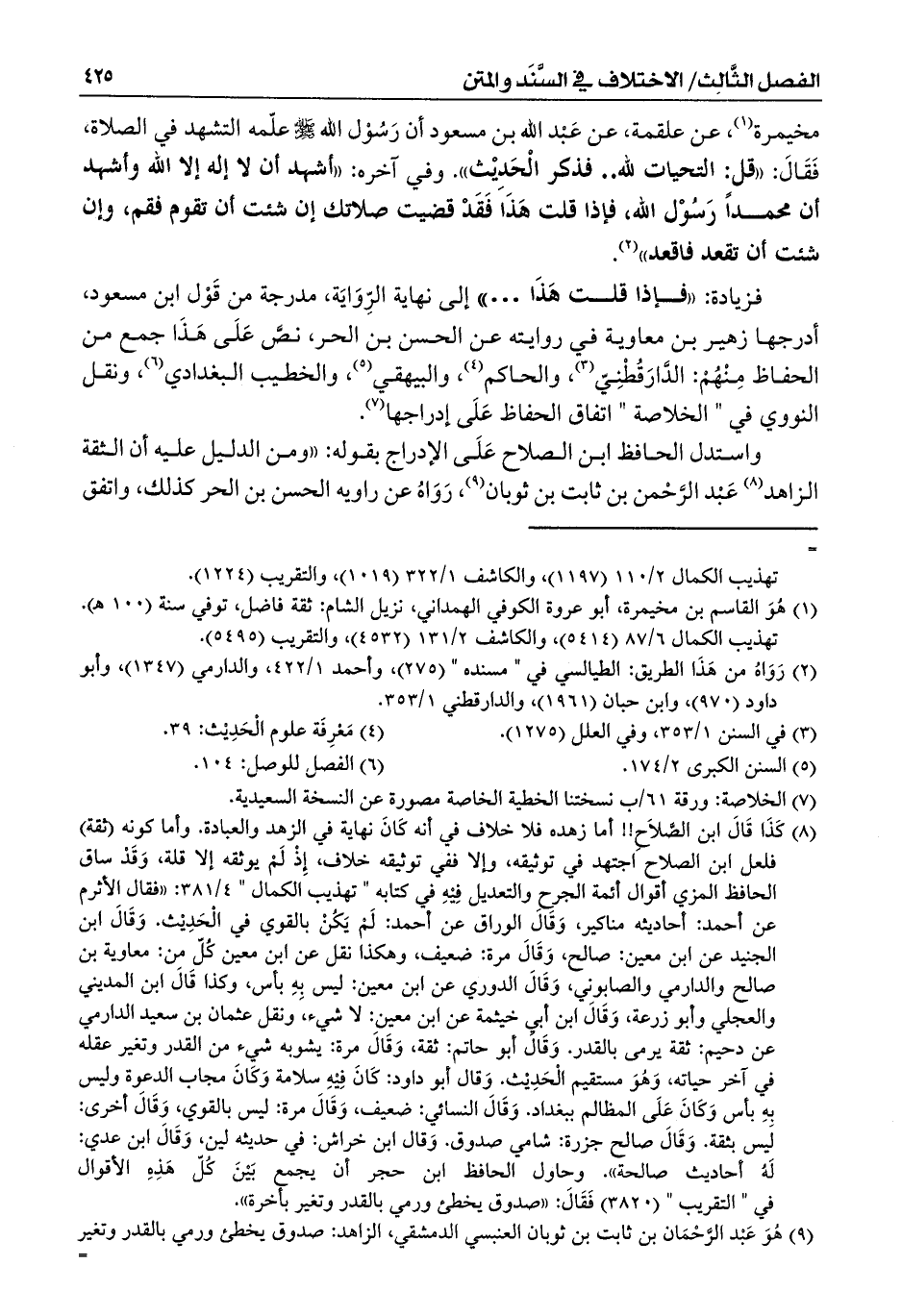 فزيادة: ((فإذا قلت هَذَا ...)) إلى نهاية الرِّوَايَة، مدرجة من قَوْل ابن مسعود، أدرجها زهير بن معاوية في روايته عن الحسن بن الحر، نصَّ عَلَى هَذَا جمع من الحفاظ مِنْهُمْ: الدَّارَقُطْنِيّ (¬3)، والحاكم (¬4)، والبيهقي (¬5)، والخطيب البغدادي (¬6)، ونقل النووي في "الخلاصة" اتفاق الحفاظ عَلَى إدراجها (¬7).