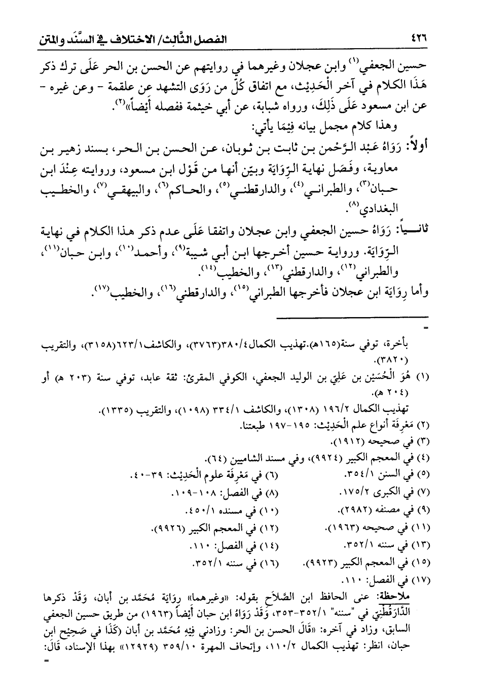 ملاحظة: عنى الحافظ ابن الصَّلاَحِ بقوله: ((وغيرهما)) رِوَايَة مُحَمَّد بن أبان، وَقَدْ ذكرها الدَّارَقُطْنِيّ في "سننه" 1/ 352 - 353، وَقَدْ رَوَاهُ ابن حبان أَيْضاً (1963) من طريق حسين الجعفي السابق، وزاد في آخره: ((قَالَ الحسن بن الحر: وزادني فِيْهِ مُحَمَّد بن أبان (كَذَا في صَحِيْح ابن حبان، انظر: تهذيب الكمال 2/ 110، وإتحاف المهرة 10/ 359 (12929)) بهذا الإسناد، قَالَ: