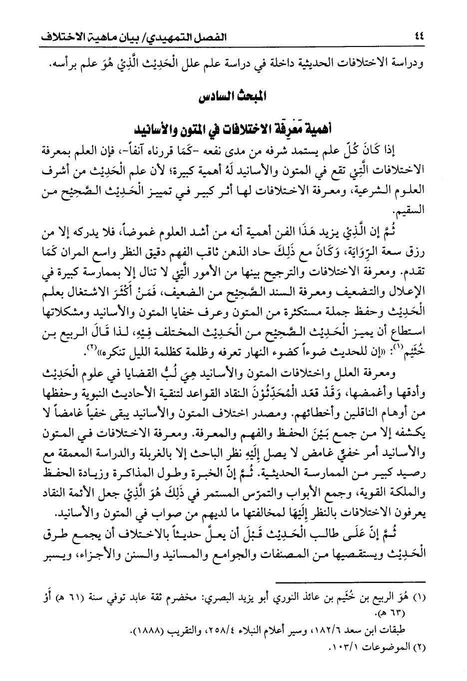 ثُمَّ إن الَّذِيْ يزيد هَذَا الفن أهمية أنه من أشد العلوم غموضاً، فلا يدركه إلا من رزق سعة الرِّوَايَة، وَكَانَ مع ذَلِكَ حاد الذهن ثاقب الفهم دقيق النظر واسع المران كَمَا تقدم. ومعرفة الاختلافات والترجيح بينها من الأمور الَّتِيْ لا تنال إلا بممارسة كبيرة في الإعلال والتضعيف ومعرفة السند الصَّحِيْح من الضعيف، فَمَنْ أَكْثَرَ الاشتغال بعلم الْحَدِيْث وحفظ جملة مستكثرة من المتون وعرف خفايا المتون والأسانيد ومشكلاتها استطاع أن يميز الْحَدِيْث الصَّحِيْح من الْحَدِيْث المختلف فِيْهِ، لذا قَالَ الربيع بن خُثَيْم (¬1): ((إن للحديث ضوءاً كضوء النهار تعرفه وظلمة كظلمة الليل تنكره)) (¬2).