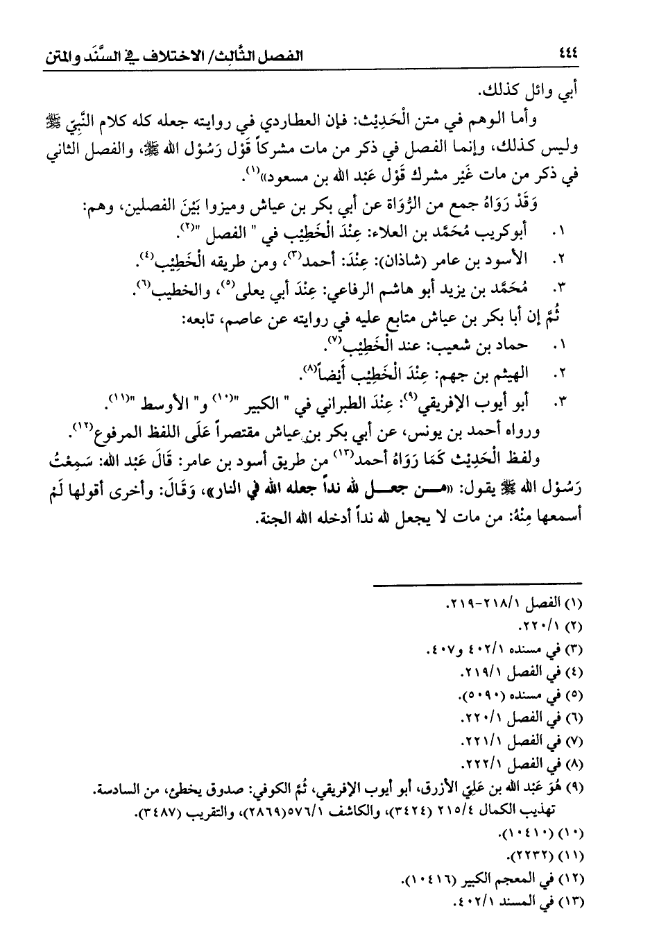 وأما الوهم في متن الْحَدِيْث: فإن العطاردي في روايته جعله كله كلام النَّبِيّ - صلى الله عليه وسلم - وليس كذلك، وإنما الفصل في ذكر من مات مشركاً قَوْل رَسُوْل الله - صلى الله عليه وسلم -، والفصل الثاني في ذكر من مات غَيْر مشرك قَوْل عَبْد الله بن مسعود)) (¬1).