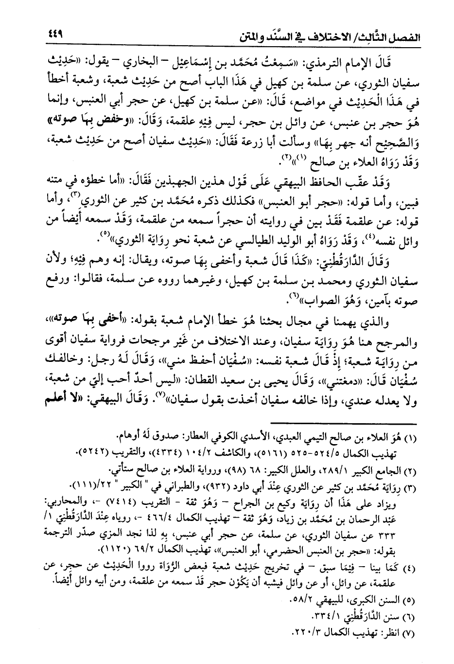 قَالَ الإمام الترمذي: ((سَمِعْتُ مُحَمَّد بن إِسْمَاعِيْل - البخاري - يقول: ((حَدِيْث سفيان الثوري، عن سلمة بن كهيل في هَذَا الباب أصح من حَدِيْث شعبة، وشعبة أخطأ في هَذَا الْحَدِيْث في مواضع، قَالَ: ((عن سلمة بن كهيل، عن حجر أبي العنبس، وإنما هُوَ حجر بن عنبس، عن وائل بن حجر، ليس فِيْهِ علقمة، وَقَالَ: