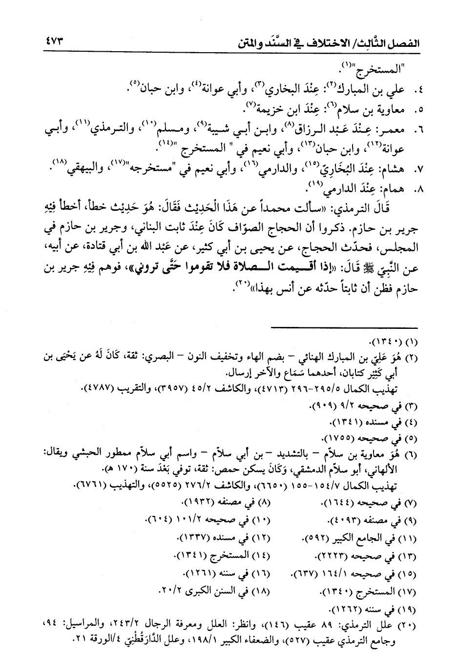 قَالَ الترمذي: ((سألت محمداً عن هَذَا الْحَدِيْث فَقَالَ: هُوَ حَدِيْث خطأ، أخطأ فِيْهِ جرير بن حازم. ذكروا أن الحجاج الصوّاف كَانَ عِنْدَ ثابت البناني، وجرير بن حازم في المجلس، فحدّث الحجاج، عن يحيى بن أبي كثير، عن عَبْد الله بن أبي قتادة، عن أبيه، عن النَّبِيّ - صلى الله عليه وسلم - قَالَ: ((إذا أقيمت الصلاة فلا تقوموا حَتَّى تروني))، فوهم فِيْهِ جرير بن حازم فظن أن ثابتاً حدّثه عن أنس بهذا)) (¬20).