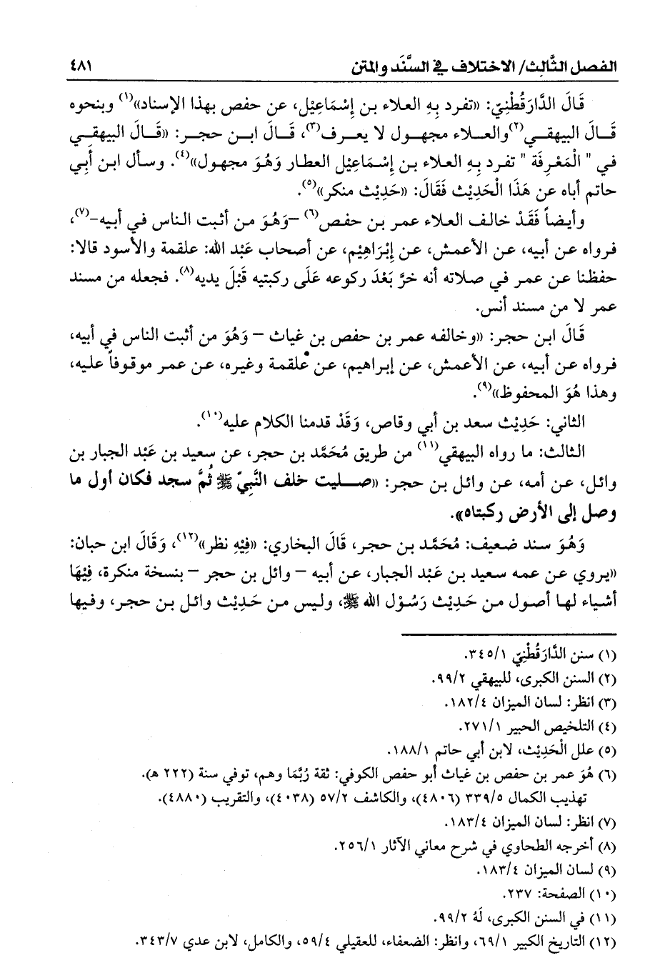وَهُوَ سند ضعيف: مُحَمَّد بن حجر، قَالَ البخاري: ((فِيْهِ نظر)) (¬12)، وَقَالَ ابن حبان: ((يروي عن عمه سعيد بن عَبْد الجبار، عن أبيه – وائل بن حجر – بنسخة منكرة، فِيْهَا أشياء لها أصول من حَدِيْث رَسُوْل الله - صلى الله عليه وسلم -، وليس من حَدِيْث وائل بن حجر، وفيها